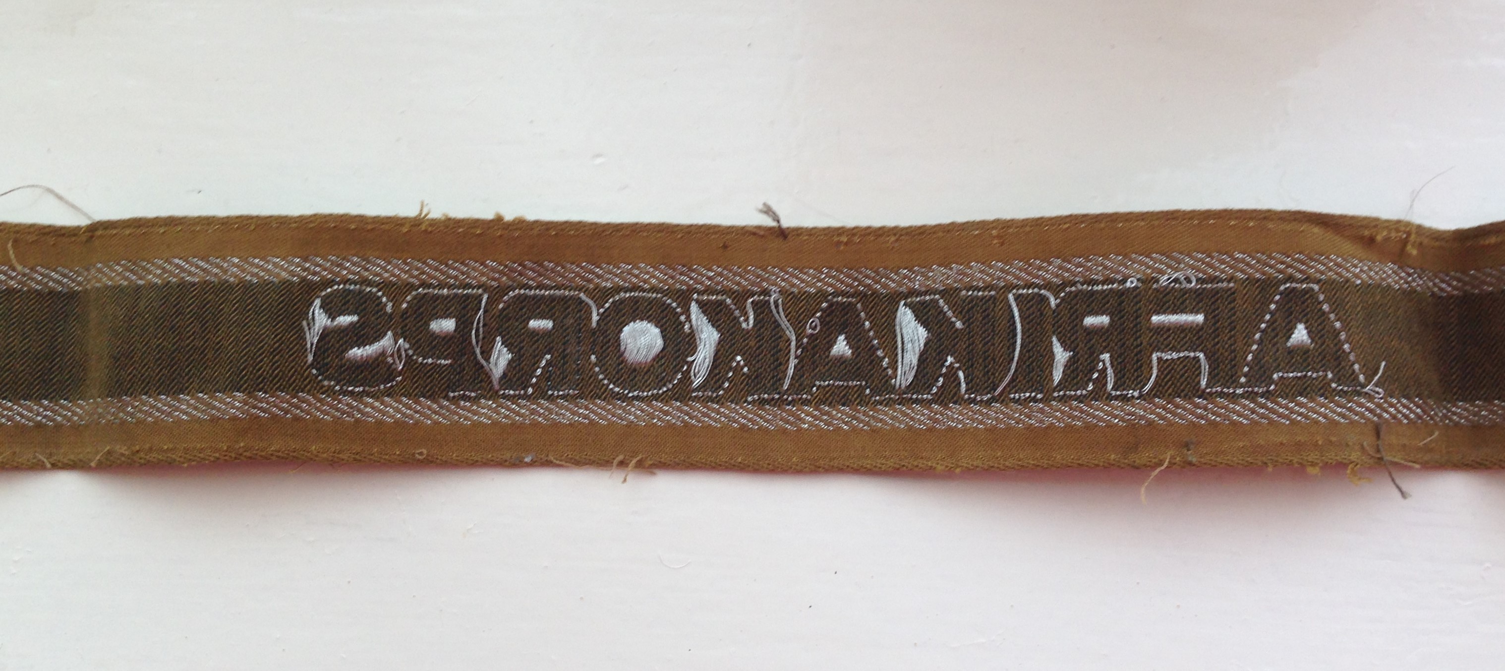 DAK D Posted April 3, 2016 Posted April 3, 2016 (edited) Here are some original variant AfrikaKorps cuff titles. 1/ This is the standard version, notice how the R and P central parts are different sizes. 2/ Reverse of the standard version. 3/ This is an original variation of the standard version, but the R and P central areas are the same size 4/ This photo shows the reverse of of the variation Afrikakorps cuff title. 5/ This is the later version with tan boarders and it is thought that this version was not issued to soldiers in North Africa. 6/ Reverse of the tan version. 7/ This is one version of the rare black Afrikakorps cuff title that was probably locally made before the standard version was issued to German soldiers in North Africa. 8, Reverse of the black Afrikakorps cuff title. Edited April 3, 2016 by DAK D 3