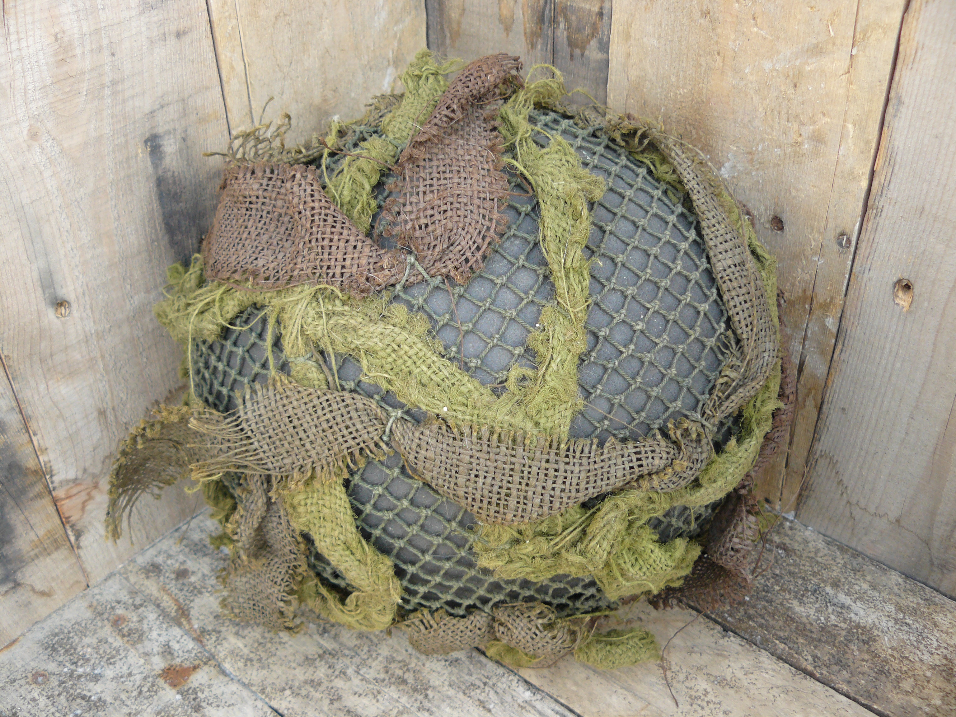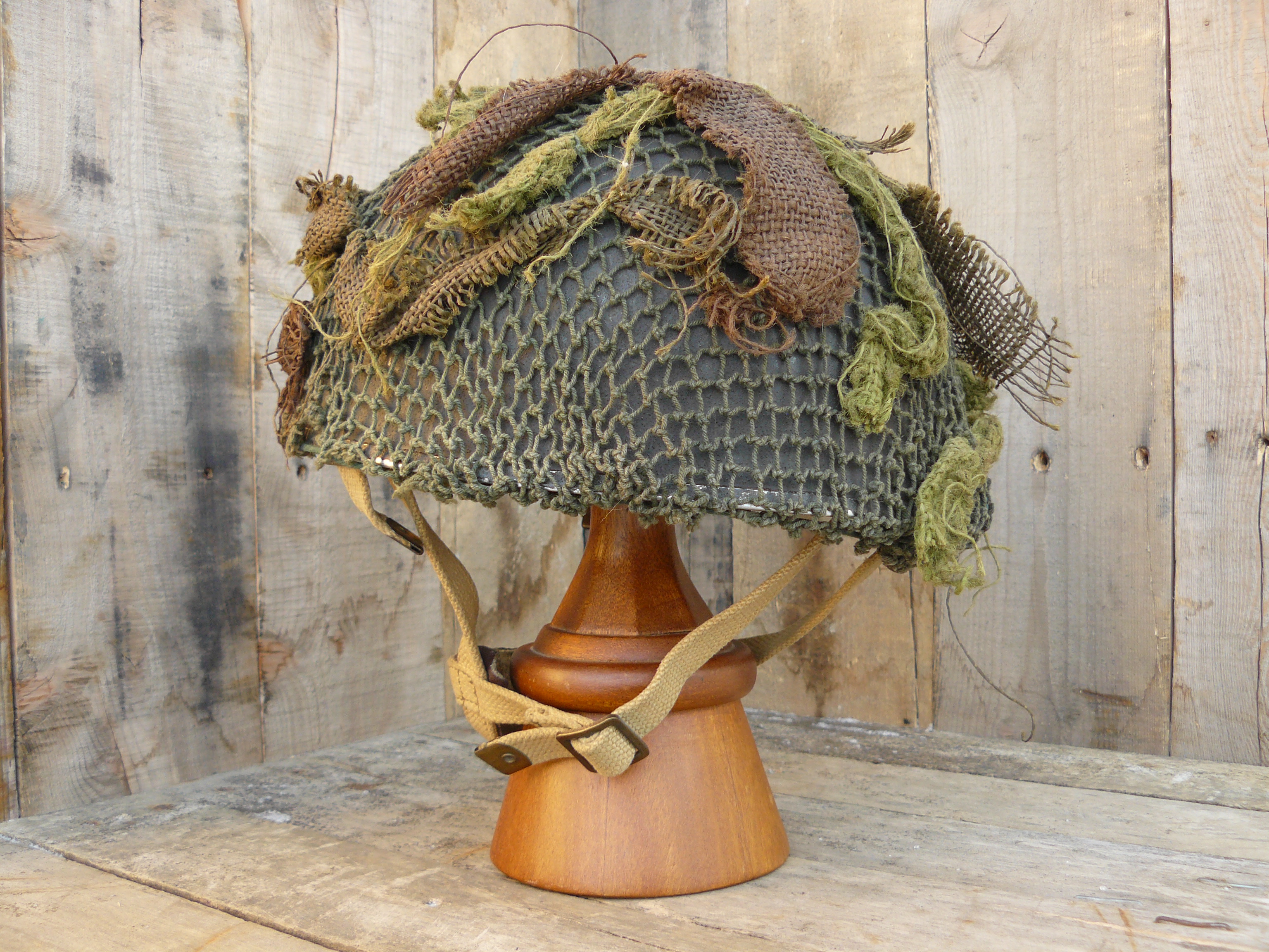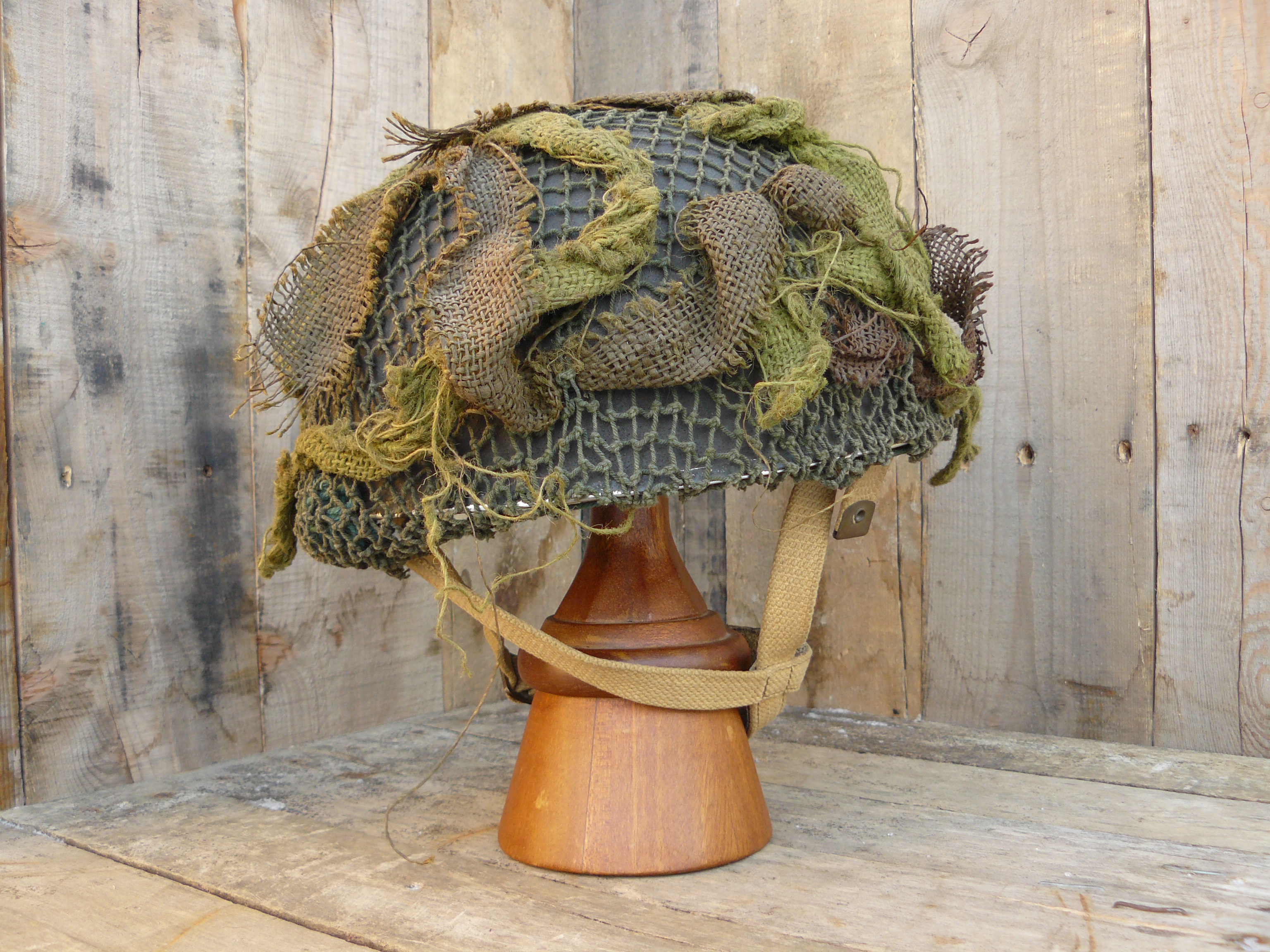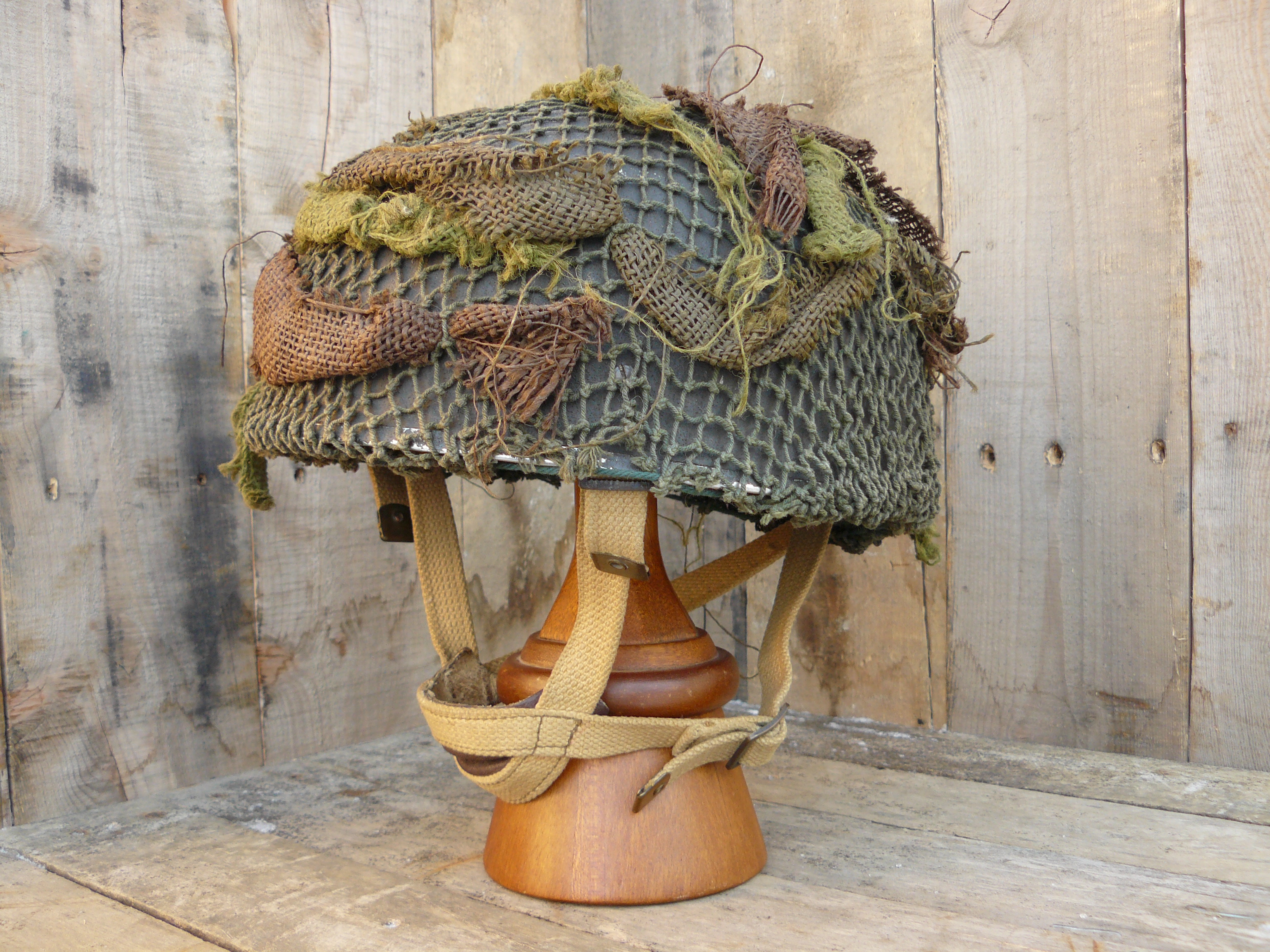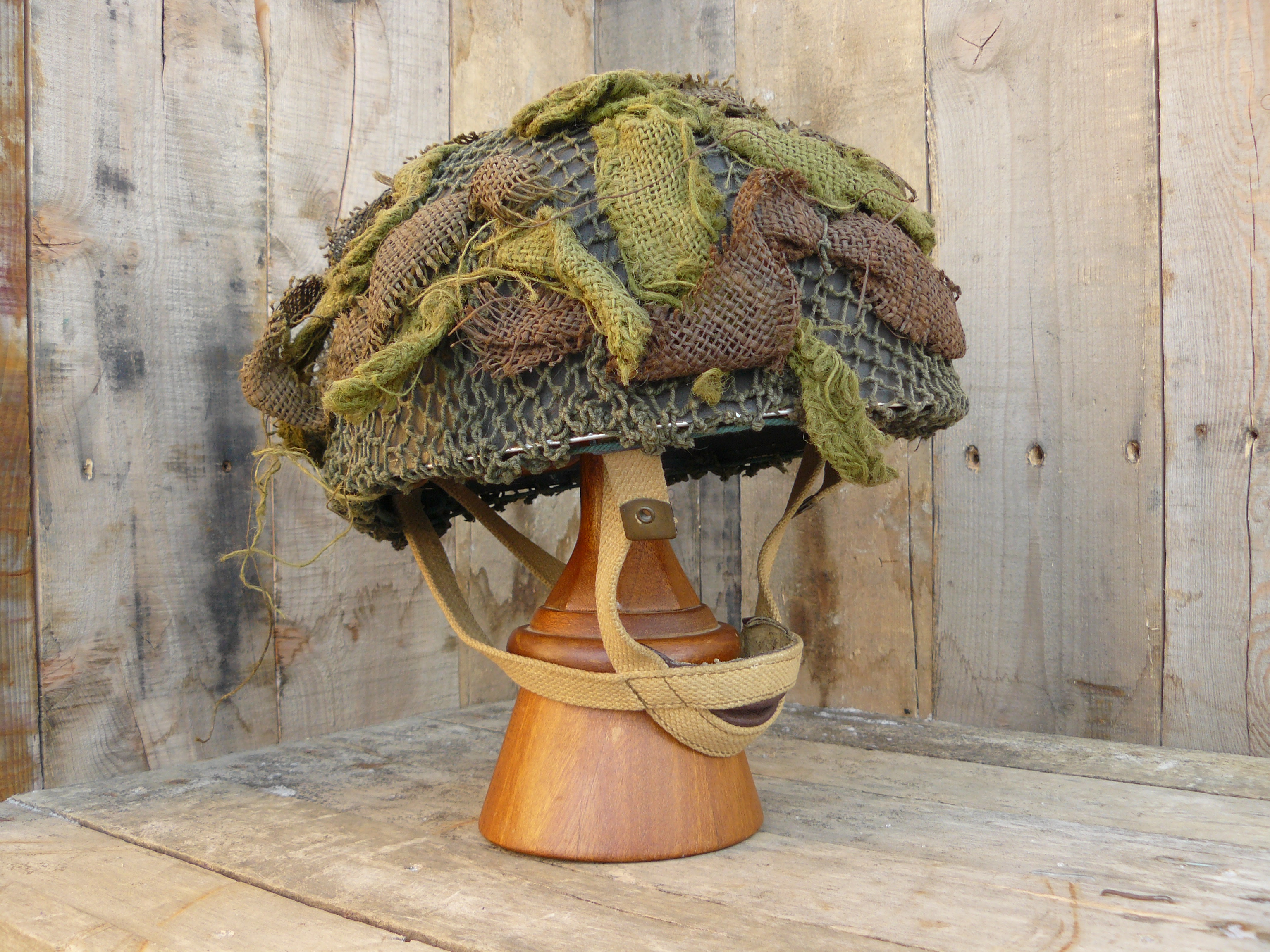Mark K Posted April 5, 2016 Posted April 5, 2016 (edited) I had been searching for a nice example of a mid war produced Mk II HSAT for some time so when I came upon this example of a Mk II it stopped me in my tracks. It is a wonderful all original example of a near mint HSAT that retains all most all of its original dark brown paint and textured finish the net has left a ghost of an impression on the exterior of the helmet body which is to be expected.The liner was manufactured by BMB and is in a nice large size of 7 3/4 the crown pad is still present with the faint out line of chalk around it. The sorbo rubber looks to still be very pliable and supple and IMO the harness looks to be spot on all and all a very nice original unmessed with helmet that has seen very little use .This particular type of multi coloured burlap first appeared very late war and was used on the larger camo nets as seen used on mobile equipment and or gun emplacements .Much of this type of burlap scrim was also used post war for many years until war time supplies were depleted .The net itself is good and was mid to late war manufactured the scrim has been tied on and woven through this net for many years I feel that the net is all original to the helmet and that it was probably used for a very short period of time either very late war and or early post war alike when you take in to account the condition of the helmet and the net as the wear and patina are a near perfect match and look to have been married together for eons.Hard to make out in the images but there is a chalk drawing on the dome pad and it is of a small cottage on a cliff shore over looking the ocean with birds aloft and a small boat out on the horizon perhaps it was drawn from boredom a soldier thinking about home or drawn by a child that has found a new medium to doodle on we may never really know.Regards Mark Edited March 11, 2018 by Mark K Add newly taken images 4