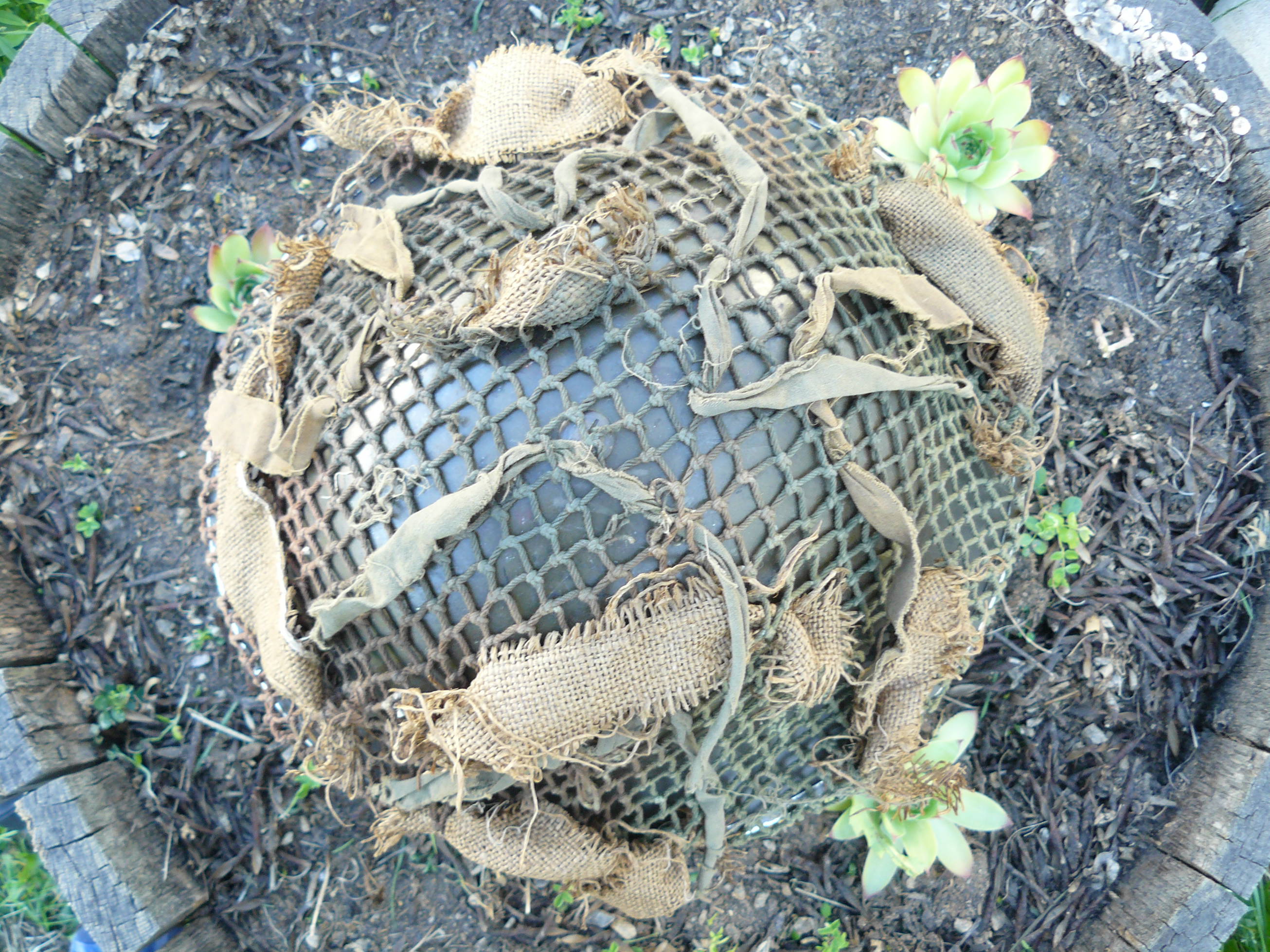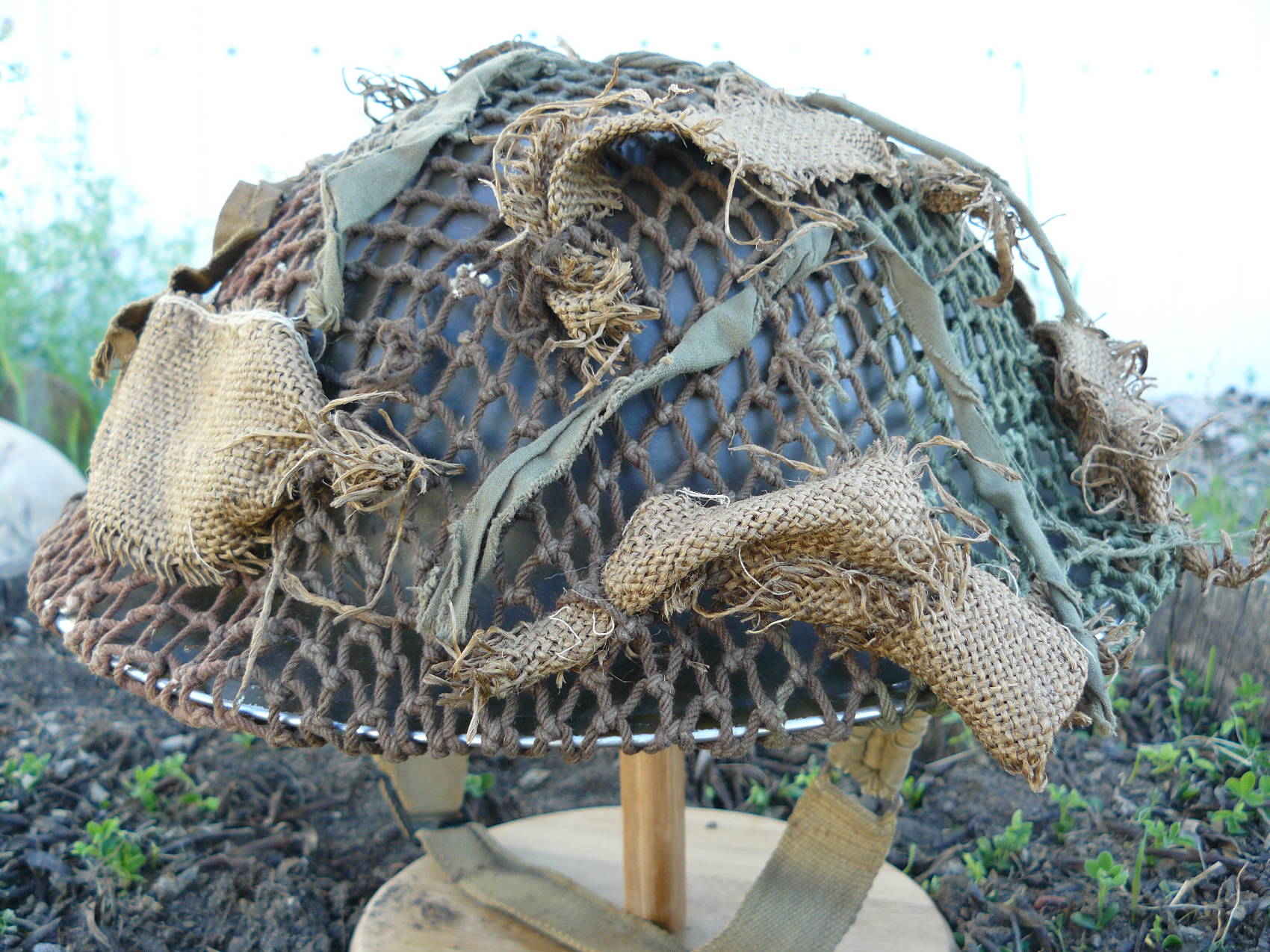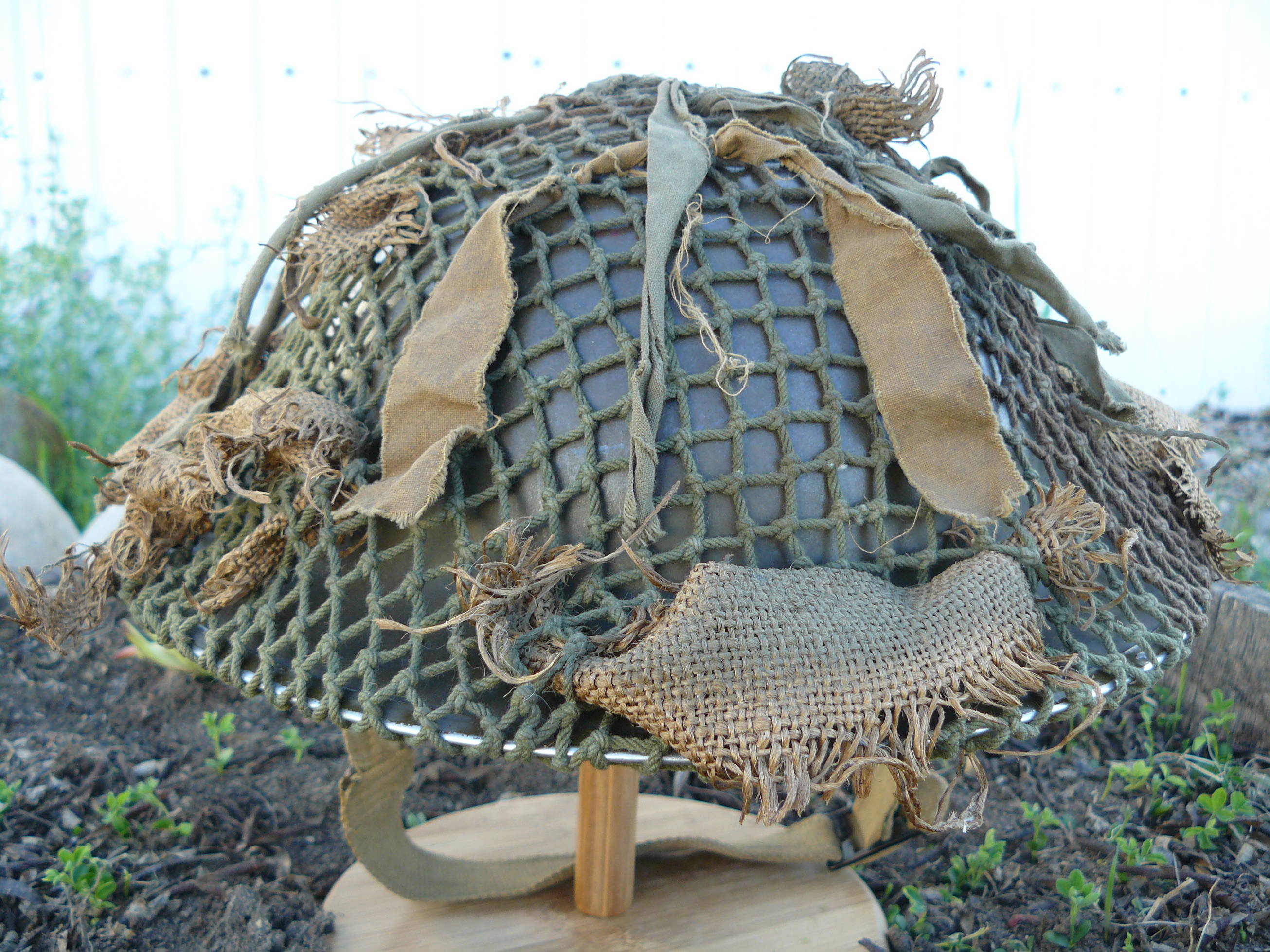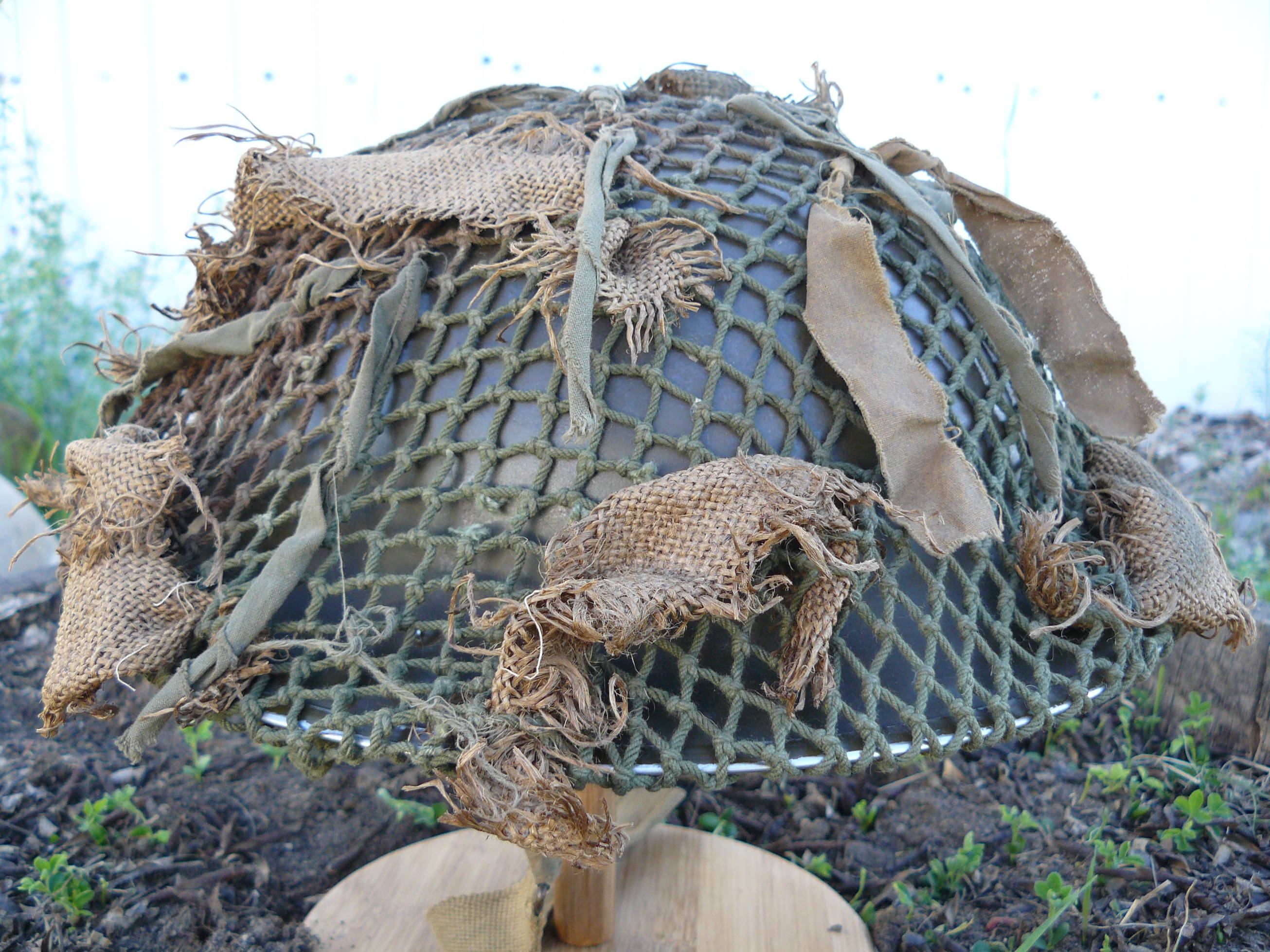 Mark K Posted April 14, 2016 Posted April 14, 2016 I have been asked on numerous occasions as to the question on woven and or knotted two tone Canadian nets the information out there is quite vague but it is my understanding that the woven nets came out first some time in and around early 1943 and were followed very closely by the knotted variation as you well know the woven nets are very labour intensive and supply and demand warranted speeding up production to accommodate the troops heading over seas.And as they are one of my favourite subjects to collect I thought I would share this late war Canadian knotted two tone from my collection these are getting increasingly hard to source with scrim of any sort on them this particular example has what would appear to be old strips of burlap from sand bags which is evident from the one piece which still shows remnants of the chain stitching that was used to close up the bottom and sides the hessian of the sand bag and a few strips of oil cloth Hessian and America Cloth (Oil cloth)This example is very dried out and discoloured so IMO it was sitting out for sometime either on display and or in the sun. Regards Mark