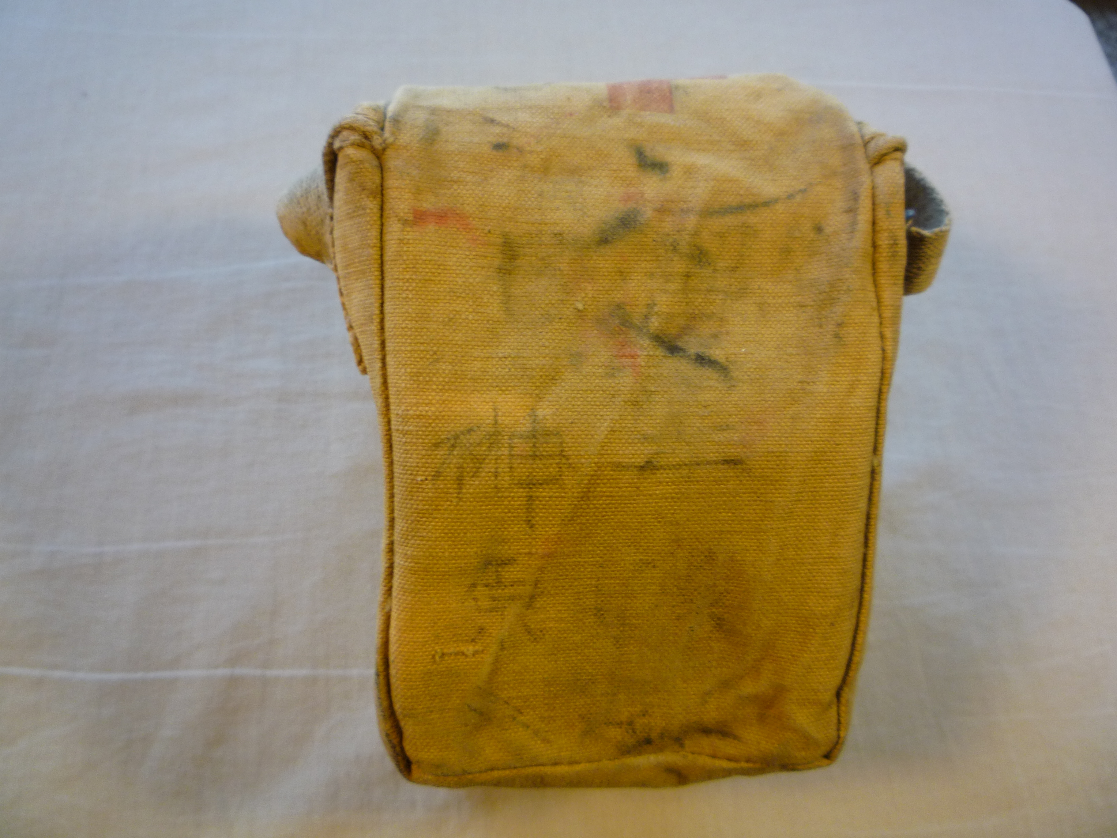 Boonie Stomper Posted March 11, 2017 Posted March 11, 2017 This is my first post as a new member, so errors & blunders are to be expected. They are not intentional. I am an older analog guy who has been drug kicking & screaming into the new digital world. Attached images are of a Japanese medic's pouch from Kiska Is. in the Aleutians. I had the privilege of friendship with a gentleman from Brome, Quebec who was a member of the famed First Special Service Force (Red Devils). He participated in all the FSSF major campaigns: Aleutians, Anzio, and the "2nd D-day", Operation Dragoon invasion of southern France, 14 August 1944. A year earlier, 15 August, 1943, the FSSF landed on Kiska Is. only to find the Japanese had already evacuated. He picked up this medic's pouch while there. I was honored to receive many of his things from his widow after his death 5 Dec. 2009. A strange twist: the FSSF was officially disbanded exactly 65 years earlier, 5 Dec. 1944. Japanese webbing (fabric & leather) and gear seems to be hard to find. Perhaps because the Japanese mostly operated in humid, tropical climates. Has anyone else out there encountered this or like items? The top is marked with a Red Cross, although I thought that they did not participate with the "Rules of Warfare". The kanji on the back is hand written so must be the owner's name or outfit. 1