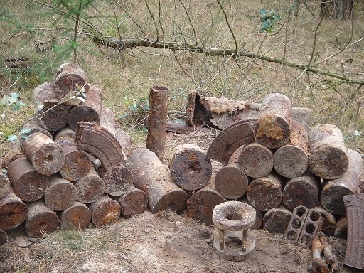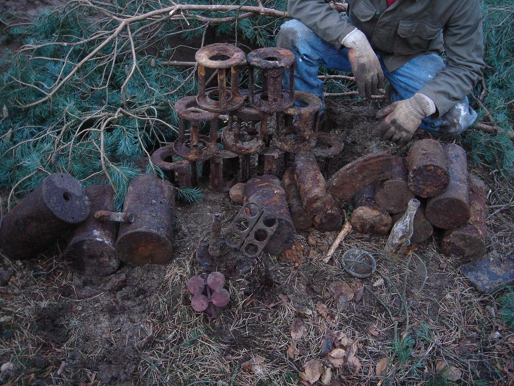 EA-Militaria.nl Posted February 22, 2016 Posted February 22, 2016 Summer 2006 was a good one! :-). Digging wise so to speak! After walking for quite some hours in a big, BIG forest we got a good, clear signal and so the digging began. Very quickly the first, big and rusty shell saw daylight after 60+ years. And after the first one, the second one came up, and a third and fourth. It looked liked we hit the jackpot! Yeah!!! :-). We can write down what we found, but we think the pictures are better. So, on the pictures you see Russian 15cm, German 15cm, German 15cm, German WOI 7.5cm and a 2cm FlaK Mag. Besides that rusty stuff we also found 2 S-mine boxes. Wooden ones. And 1 was in very good condition. (And still is) On the picture below you also see a MG Laufschutzer and a 10cm shell. You would think, they would never find British stuff among all the German stuff….you think wrong :-). Suddenly we came across 5 ammo boxes. All in pretty good condition with a lot of paint and text. Funny thing is that the boxes were full of 2cm FlaK casings. Also amongst the thing we found were the sickgranate racks. Found 3 of them. And found a Gurtfuller for loading the MG ammobelts. In total we found around 125 big shell cases, a couple of 2cm Mags, Bren Mags, a Panzerschreck protectionplate, a bunch of shell protectors and lots more. 3