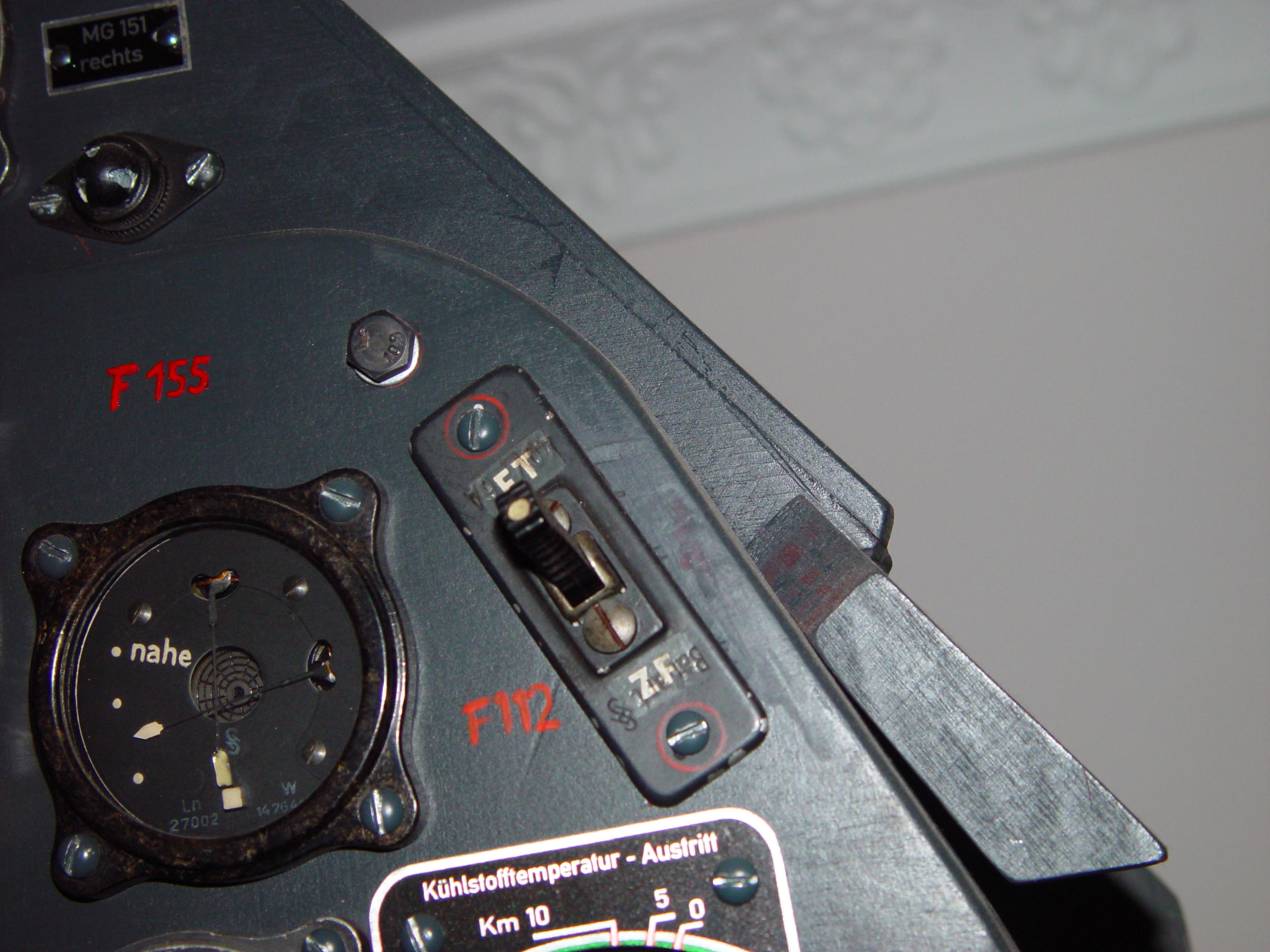 Funksammler Posted January 6, 2019 Author Posted January 6, 2019 A bit more on the Fug16zs installation. The radios in the back of the aircraft are remotely controlled from the cockpit. The frequency selector switch, DF mode switch and AFN/2 indicator instrument are fitted to the instrument panel for the Messerschmitt Bf 109 G-6: The frequency selection switch chooses one of four frequencies, it was fitted to a extension to the bottom right of the Bf109 panel. Different variations of the selection switch exist: numbers (like here), with I, II, triangle, square (with channel I in green and other channels in red for the FuG16zy) etc. Note the remains of green and red paint applied to the rim of the frequency switch, indicating that the aircraft was re-fitted with the FuG16zy at a later stage: The AFN/2 and DF mode switch are placed on the top right of the panel. With the mode switch set to "ZF", the AFN/2 instrument will indicate wether the aircraft is flying to the left or to the right of the beacon transmitter, to fly towards the beacon transmitter, the pilot has to hold the AFN/2 needle in the middle. The Horizontal needle gives and indication of signal strength (= distance). With the mode switch set to "FT", the radio is purely used for voice communication: A further two controls were placed on the cockpit floor on the right side of the seat: the volume control and the receiver fine tuning control. The receiver fine tuning control (FBG16) controls the central remote drive unit on the FuG16 and it allows the receiver to be fine tuned in relation to the transmitter. The pilot would turn the knob until the signal is at its strongest. The volume control unit (ADb 18) has a volume control knob and a switch controlling the transmitter output power. When switched to "Fern" (far), the transmitter is used on full power; on "Nah" (near), the output power is reduced. The "Nah" position was used if aircraft were flying close together in formation. Note that the panel has a subpanel fitted under the main panel. This is a bomb fusing panel specific to fighter bombers. The fusing panel has an additional pair of switches on the right hand side, this was for arming the 21cm rockets of the "BR-Gerät" mounted under the wings. This gives the fighter bomber an extra punch in the ground attack role: Although several ground attack missions were flown early on in the Normandy campaign, very little is known of their success. With bombs and rockets fitted under the wings, the drag must have reduced the speed of the BF109 significantly, making them easy prey for allied fighters. I suspect many missions had to be abandoned before reaching the beachhead, with the fighters jettisoning their bomb and rocket loads to give them a chance of escape. regards, Funksammler