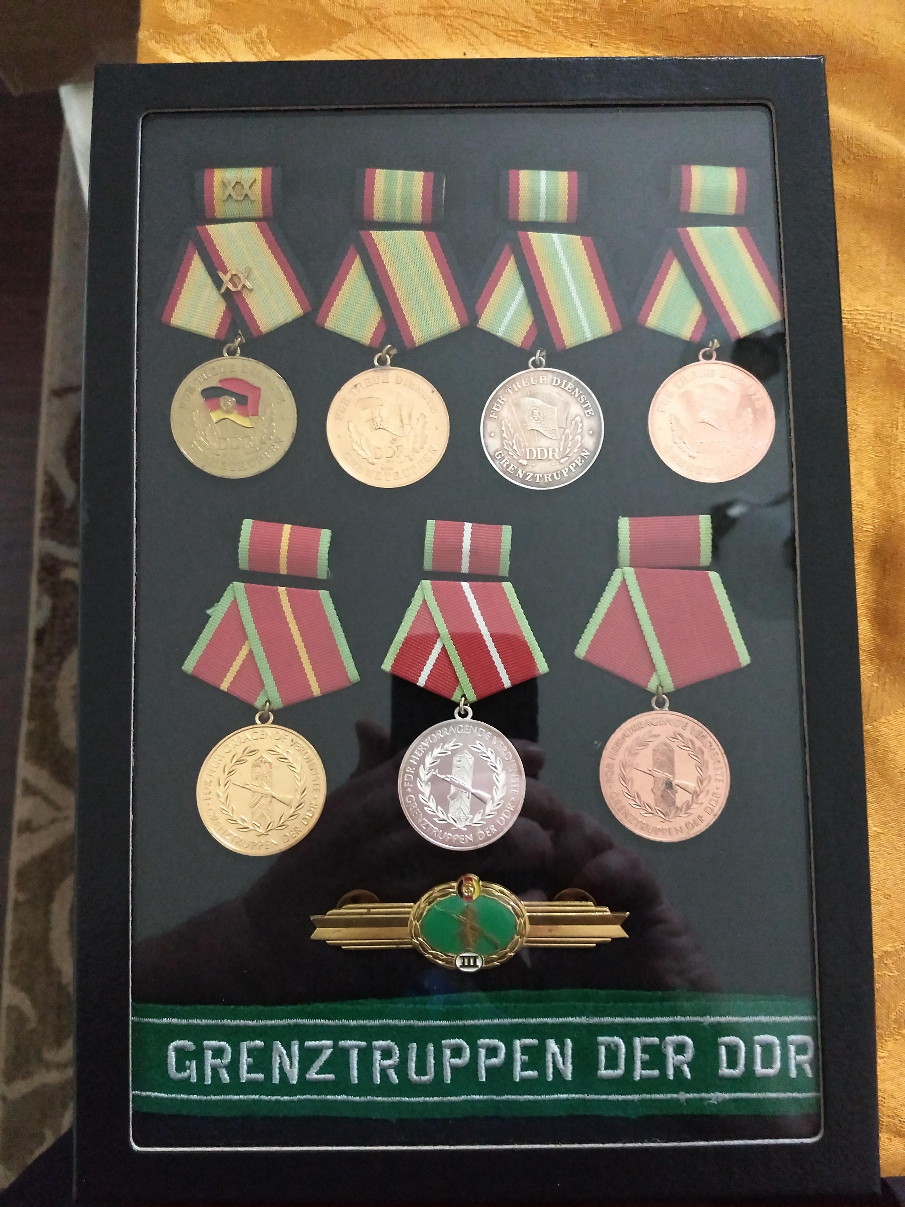 Mike H Posted September 6, 2019 Author Posted September 6, 2019 (edited) Grenztruppen display I put together. Long Service on top row, 2nd row Merit Medals, 3rd is a Qualification Badge and last is the Cuffband Edited September 6, 2019 by Mike H 2 1