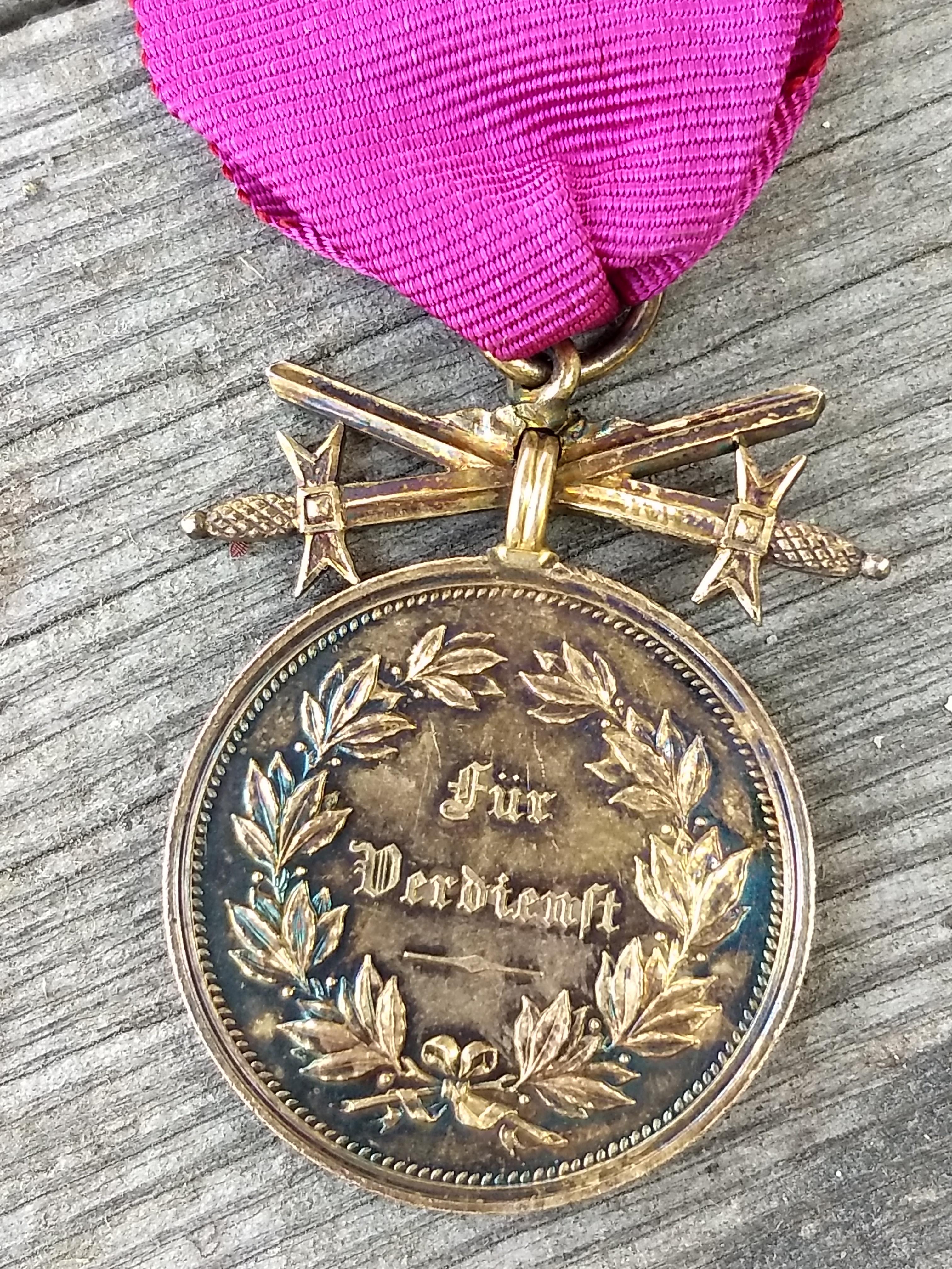 Mike H Posted October 5, 2019 Author Posted October 5, 2019 From the Principality of Reuss their Golden Merit Medal w/Swords awarded to NCO's only. This one came on Reuss Amaranth ribbon. I'm very happy to have gotten this one. 1