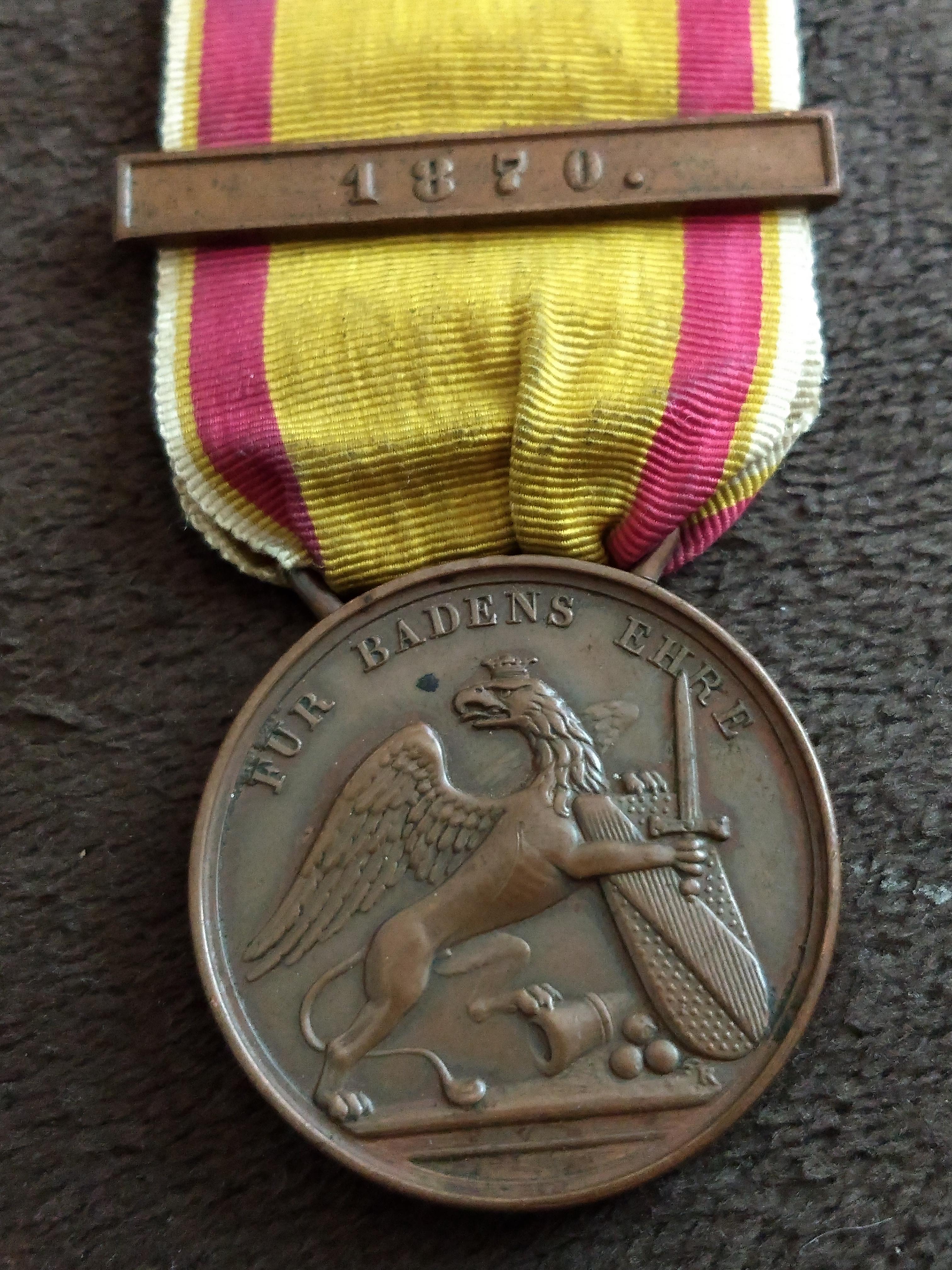 Mike H Posted November 9, 2019 Author Posted November 9, 2019 Baden Field Service Decoration with 1870 Clasp. Medal was instituted 27 Jan. 1836 by Grand Duke Leopold and was awarded as a general service medal and for specific campaigns. On 7 Sept 1866 Grand Duke Friedrich instructed that clasps for the ribbon be awarded to denote the campaign concerned. It was awarded retrospectively for campaigns as far back as the Napoleonic Wars of 1805 and was last issued in 1871. There were 18 different clasps in all. 1