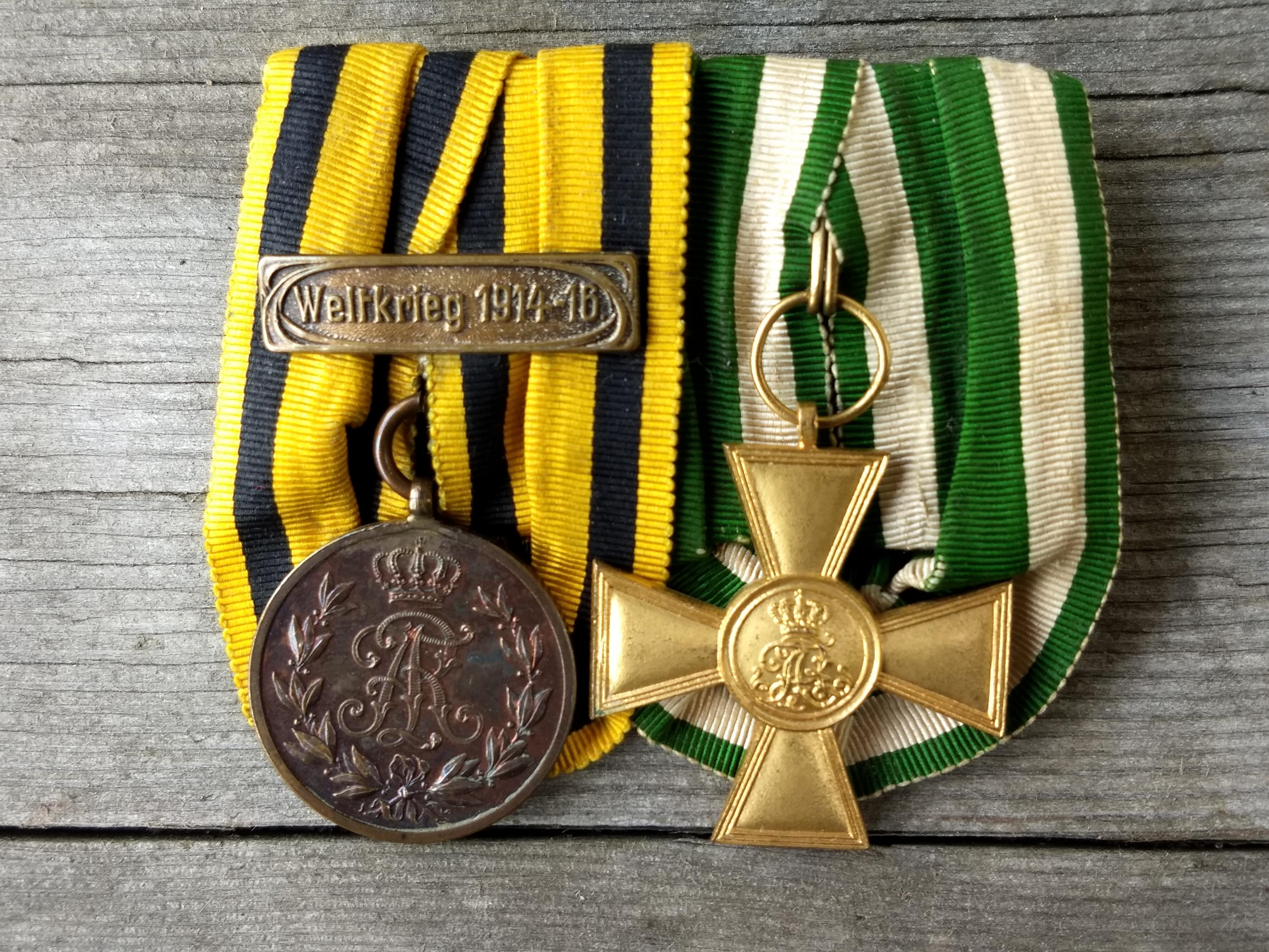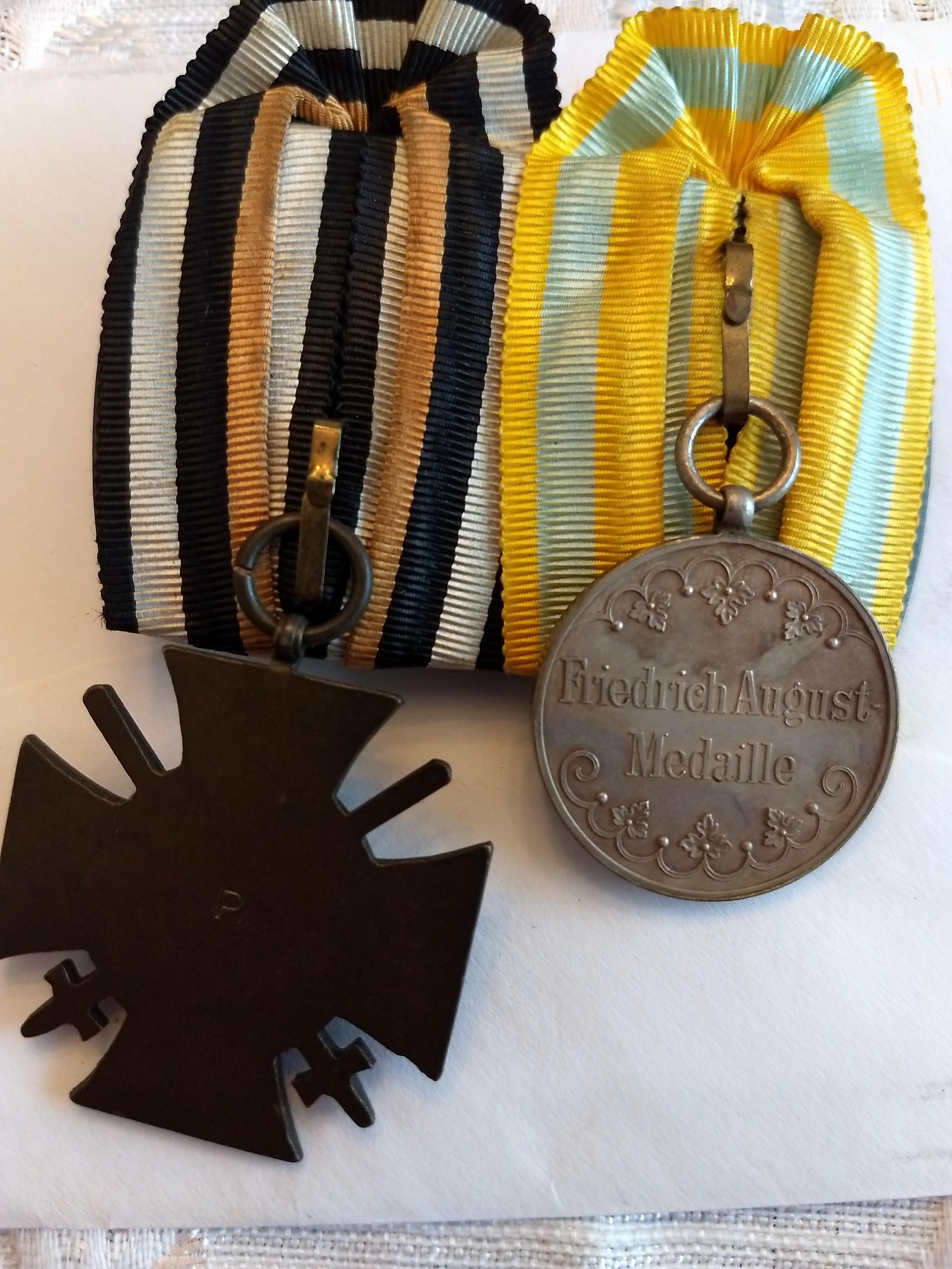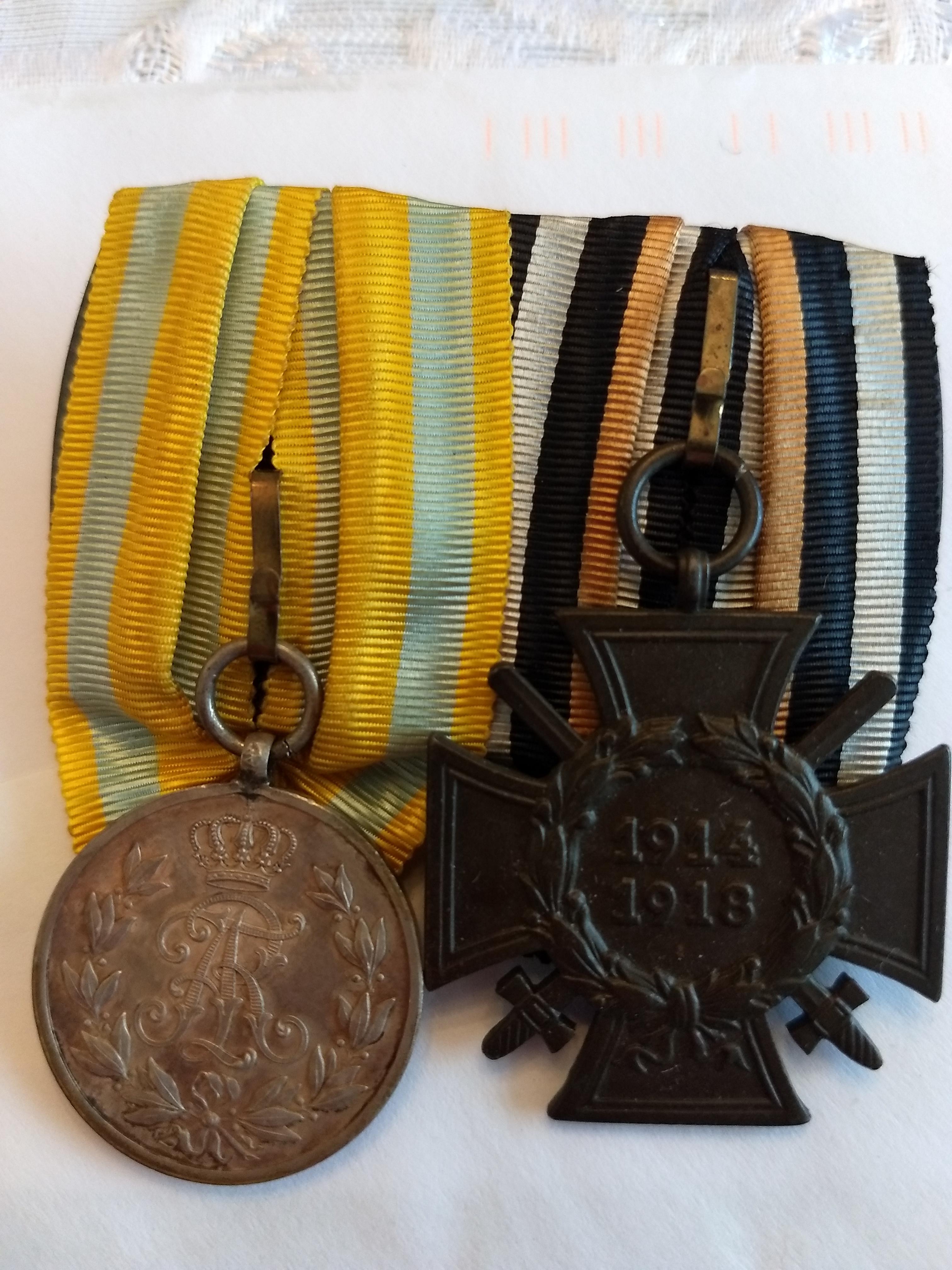 Mike H Posted November 29, 2019 Author Posted November 29, 2019 Nice little Saxon Bar consisting of Saxony's Friedrich August Medal in Silver on war ribbon and Hindenburg Cross. The Friedrich August Medal was awarded for Meritorious Service to NCO's and enlisted ranks. During war it was Saxony's equivalent of the EK II. If awarded during peace time the ribbon was yellow with two outer black stripes and a slimmer black stripe running down the middle. 1 1
