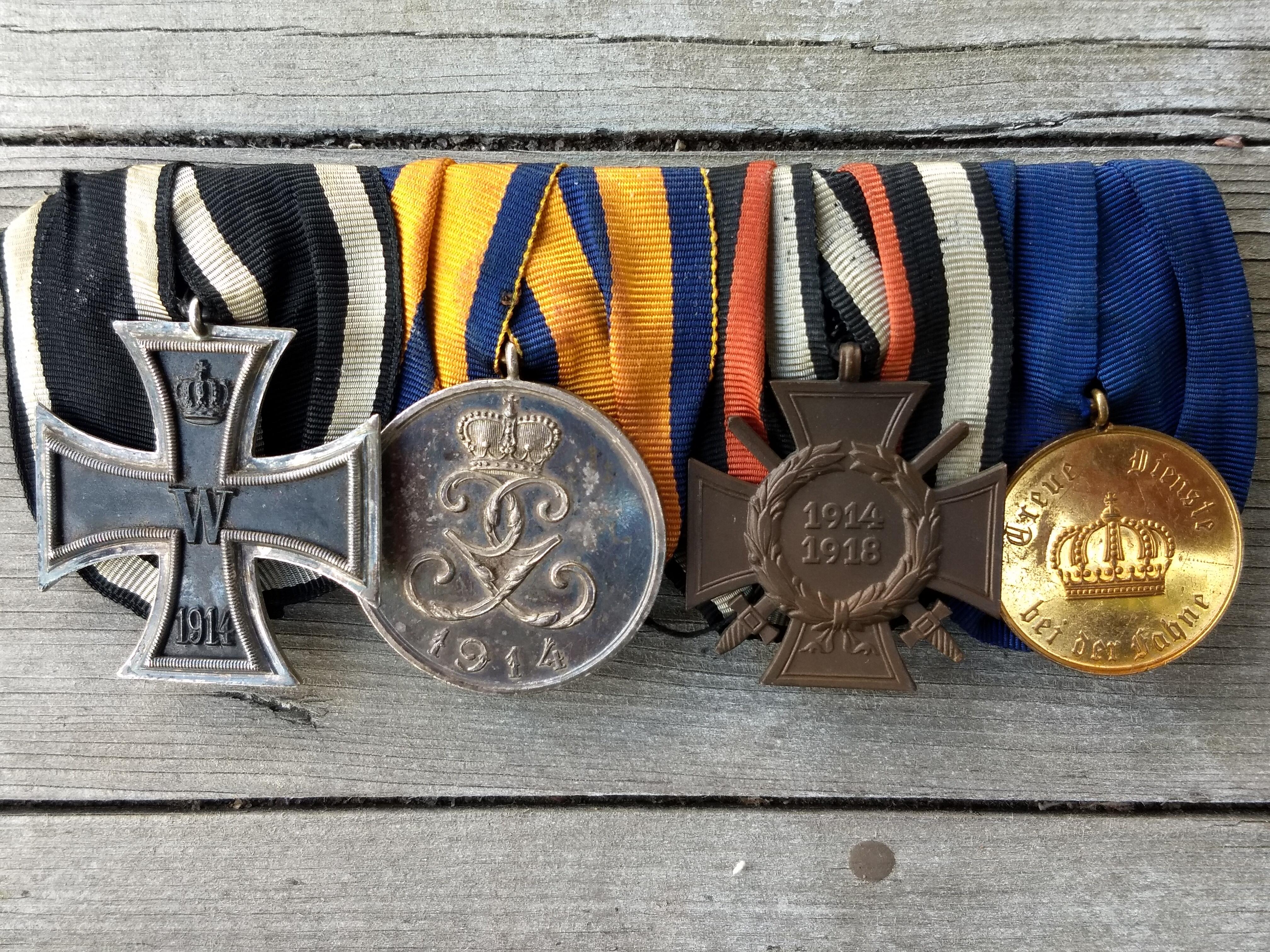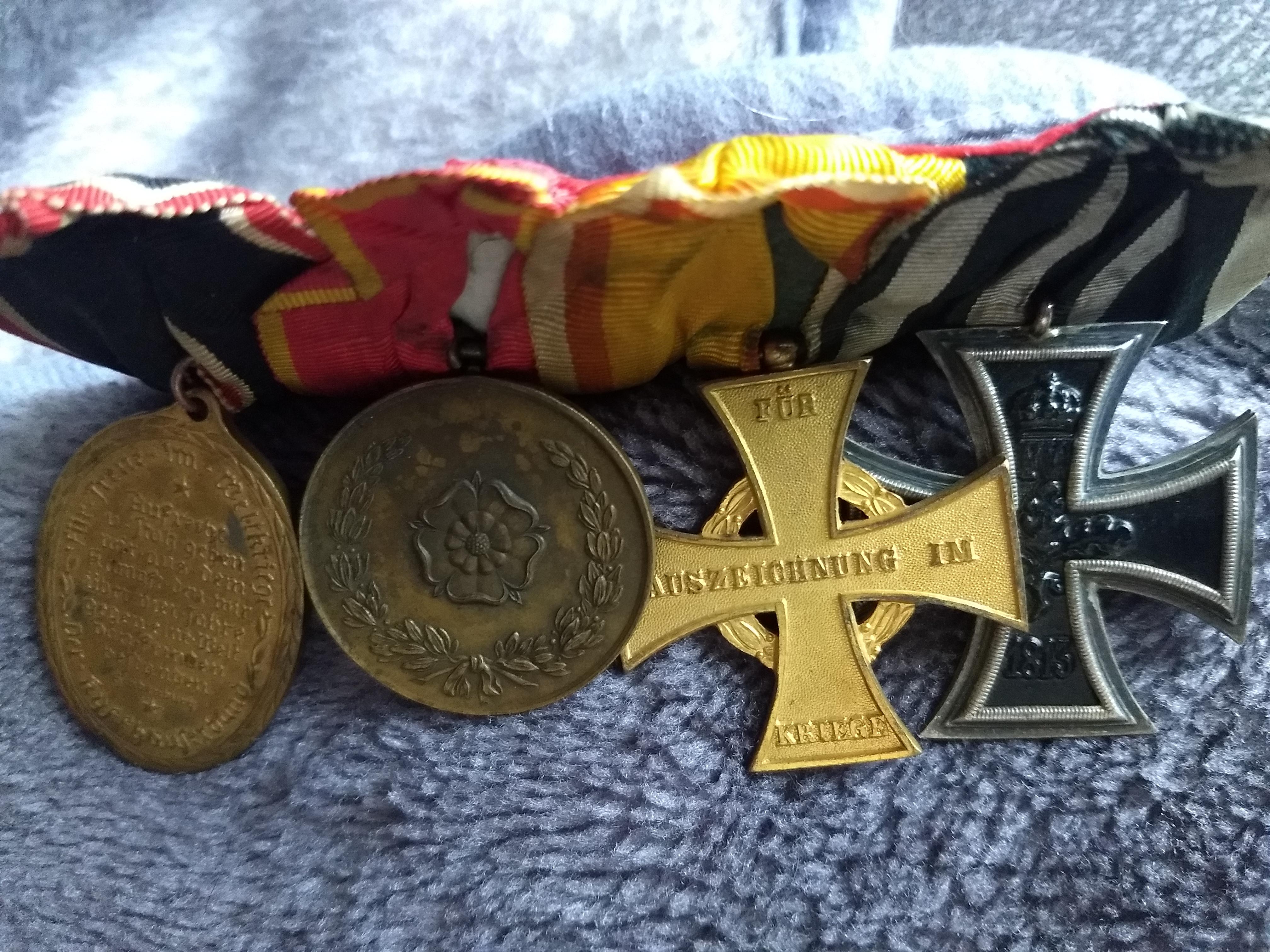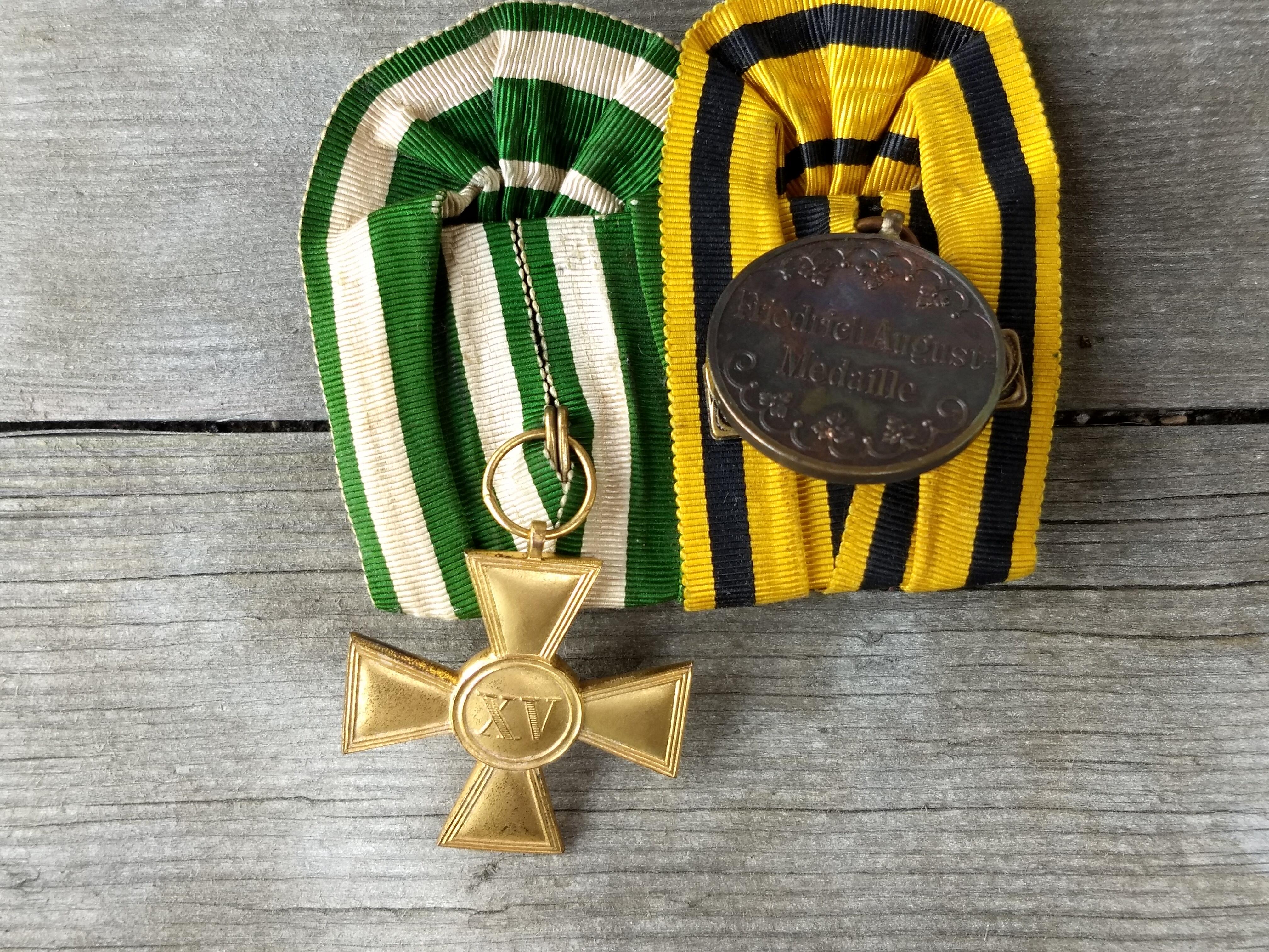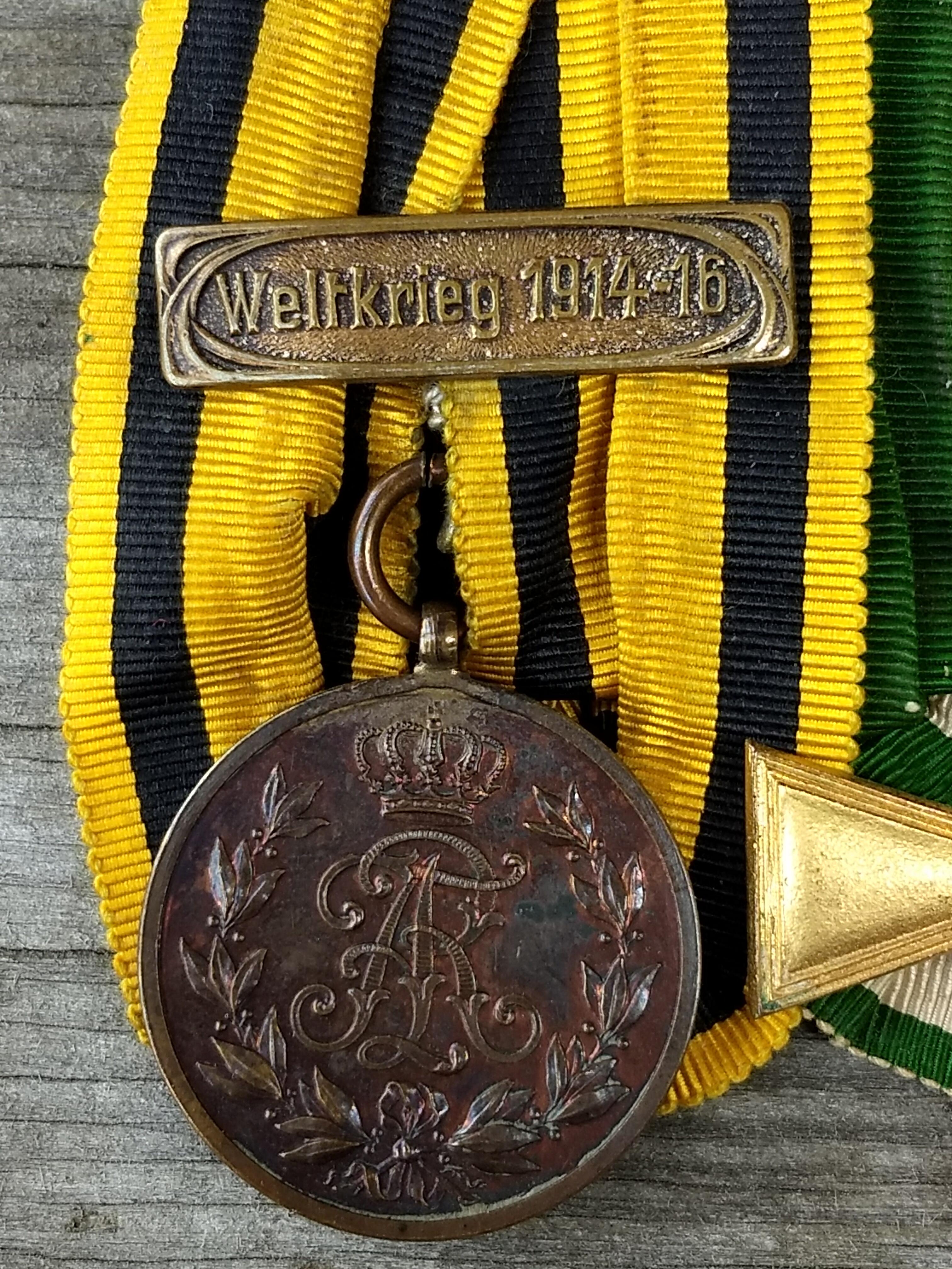 Mike H Posted November 29, 2019 Author Posted November 29, 2019 Nice little Saxon Bar consisting of Saxony's Friedrich August Medal in Silver on war ribbon and Hindenburg Cross. The Friedrich August Medal was awarded for Meritorious Service to NCO's and enlisted ranks. During war it was Saxony's equivalent of the EK II. If awarded during peace time the ribbon was yellow with two outer black stripes and a slimmer black stripe running down the middle. 1 1
