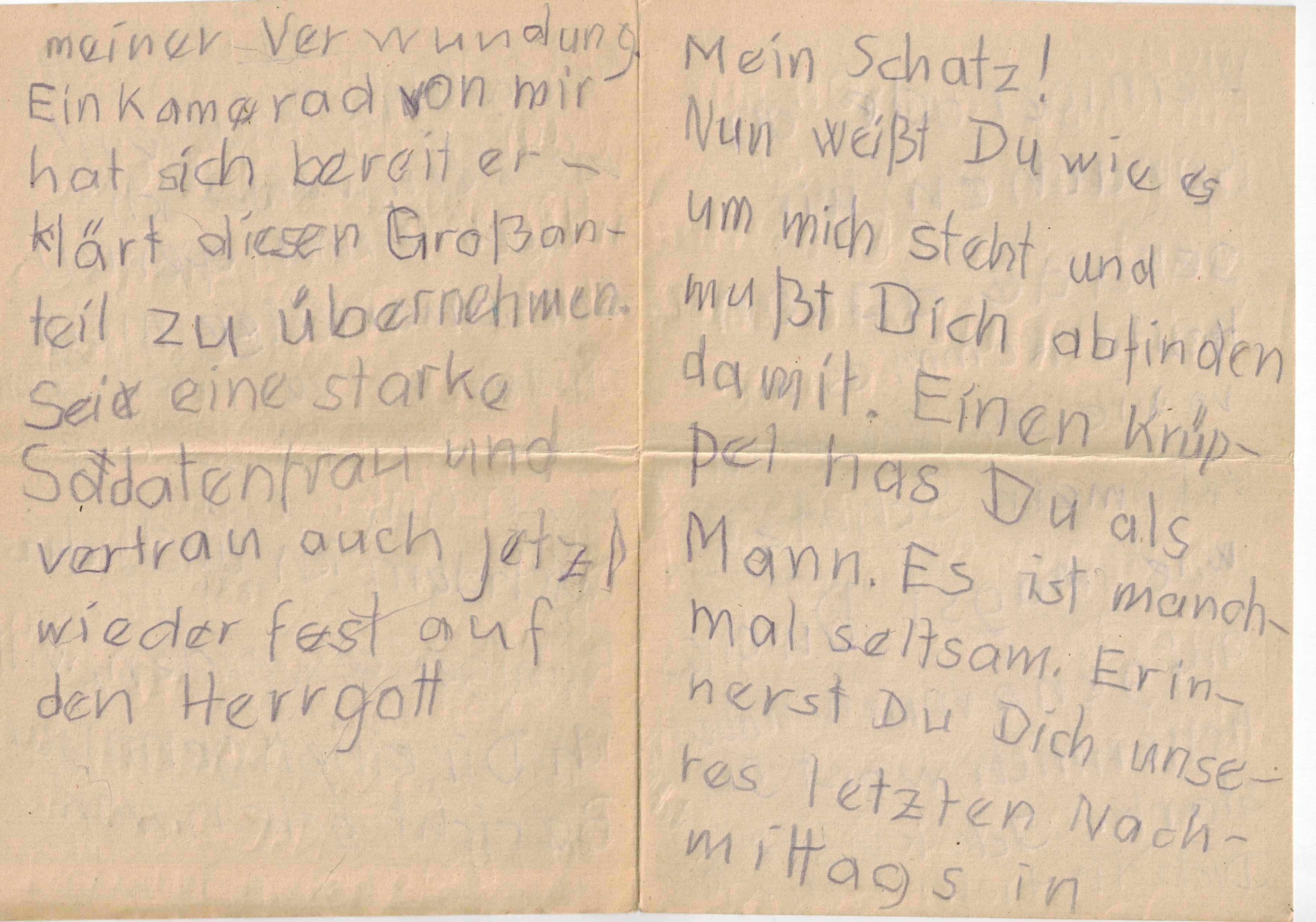 Richard Auld Posted August 8, 2019 Posted August 8, 2019 Guys, Been out to play today and have got this group. It is from a young couple, he appears to be a tank man and she and actress. She enjoyed some success post war I can see from what I have here in the group but rather like her war time pass. It seems she was at some point married to the you officer and he was injured in 1942 with gunshot wound to the lungs and in 1943 blown up by a mortar round loosing an arm and a leg in due course before dieing of his wounds in 1944. His young wife writes to OKW to ask permission to be by his bedside to give hime strength to recover from his wounds, he sends her a telegram stating she should under no circumstances visit the feld lazaret. She then gets a series of letters formally informing her of his death. She also has a feldpost that appears to at first glance have been written by a childs scrawl but reading into his wounds and eventual loss of his right arm it could be he used his left hand to lesser effect. It is without doubt written by him as it reffers to his injuries and operations. The whole thing kind of reminds me of the German small series Unser Muetter, Unser Faetter! Rich 1