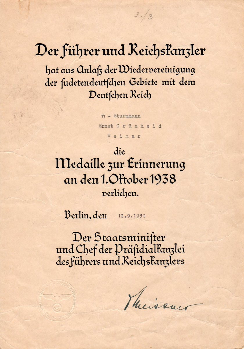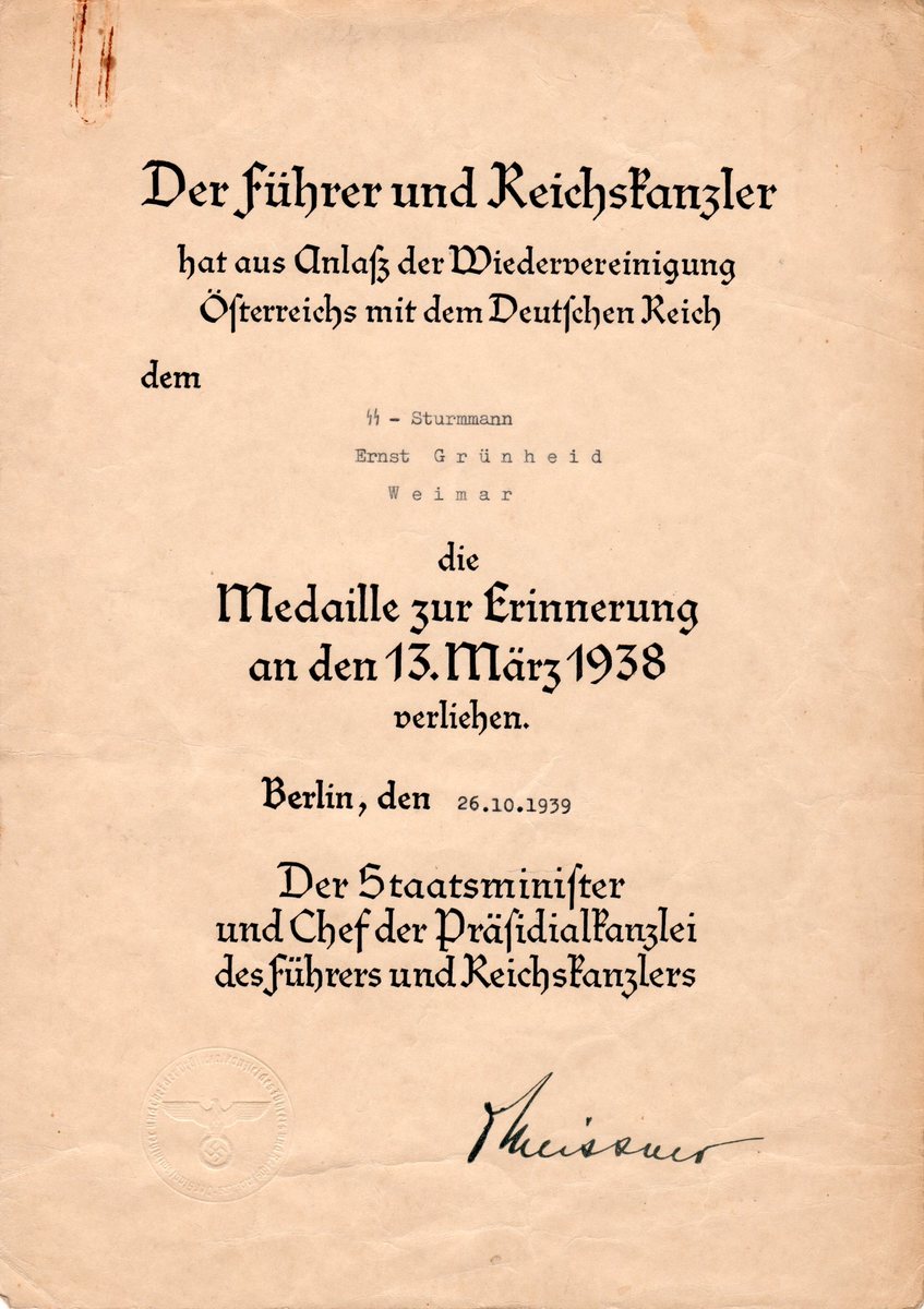 Christopher Ailsby Posted February 28, 2016 Posted February 28, 2016 Pin of Honour of the SS-Heimwehr Danzig citation No 1449 - Grünheid Ernst – SS-Sturmmann