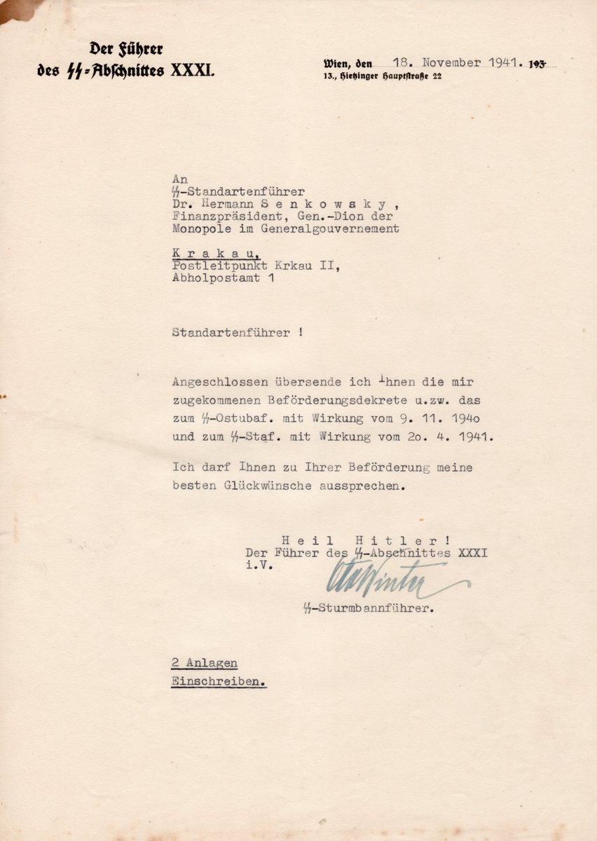 Christopher Ailsby Posted March 1, 2016 Posted March 1, 2016 Senkowsky Hermann Dr.- SS-Standarten führer promotion doc Senkowsky Hermann Dr.- SS-Standartenführer 31 July 1897 05 April1965 D. Party Number 1089376 SS Number 310369 Silver Tapferkeitsmedaille II. Klasse, Signum Laudis with Swords, Karl-Truppenkreuz, Cross of Honour 1914-18 Combatants, 25.10.1940 Kriegsverdienstkreuz II. Klasse, SS-Zivilabzeichen (Nr. 169.582), Winkel für alte Kämpfer, SS Honour Ring 31.07.1897 born in Scheibbs (Lower Austria) 1903 - 1905 elementary school in Scheibbs 1905 - 1907 elementary school in Pöggstall (Lower Austria) 1907 - 1915 secondary school in St. Pölten (Lower Austria) 23.03.1915 exams with commendation 15.04.1915 Volunteer Ersatzbatterie of the k.u.k. Feldkanonen-Regiments 5, Brünn, Czech 1915 officer patent with rank number 1 08.1915 - 02.02.1916 NCO-instructor at the Ersatzbatterie of the k.u.k. Feldkanonen-Regiments 5 03.02.1916 first active service in Wolhynia, served as platoon leader and recon-officer at the 4. Batterie of the Feldkanonen-Regiments 5 04.1916 - 07.1916 in hospital suffering from pleurisy 07.1916 Ersatzbatterie of k.u.k. Feldkanonen-Regiment 5 08.1916 k.u.k. Reserve-Feldkanonen-Regiment 62 (Isonzo ), first adjutant of 1st division, then 3rd adjutant and finally sole adjutant of Artilleriegruppe Oberst Blaschke 09.1916 Fähnrich d. R. 01.01.1917 Leutnant d. R. 06.1917 moved to Idria with his regiment, then assigned to Batterie 2 of Reserve-Feldkanonen-Regiment 62 07.1917 moved to the coal district of Mährisch-Ostrau with his regiment („where a bolshevic general strike was subdued“), then back to Idria 01.02.1918 renaming of his unit to Batterie 1 of Feldartillerie-Regiments 162, there Batteriekommandant 12.11.1918 in Vienna released from duty Awards: Silberne Tapferkeitsmedaille II. Klasse, Signum Laudis mit Schwertern, Karl-Truppenkreuz 1919 study of law at the university of vienna 1919 member of the Großdeutsche Volkspartei 10.1919 - 12.1921 continuation of his study at the university of Innsbruck 21.01.1922 doctorate in Innsbruck 26.01.1922 - 02.1928 at the higher customs office Vienna 02.1928 customs office of the Austrian Federal Ministry for Finaces 1929 at the same time teacher for customs law at the university for wordl trade in vienna 01.1930 secretary of ministry 04.1930 - 12.1930 substitutional official at the Reichsfinanzministerium (customs) in Berlin 20.05.1932 entree NSDAP/Ortsgruppe Wien-Hernals (Member 1.089.376) 09.1932 leader of Unterabteilung IVa1 (fiscal policy) in Hauptabteilung IV (economy) of NSDAP Austria 11.1932 – 1933 substitute of the leader of Abteilung IVa (economic policy) of NSDAP Austria 1933 (summer) - 03.1934 leader of Abteilung IVa (economic policy) of (illegal) NSDAP Austria 03.1934 - 08.1934 group leader of Abteilungen IVa by e of (illegal) NSDAP Austria 01.04.1934 entree Austrian SS as SS-Anwärter 01.07.1934 SS-Mann 15.07.1934 SS-Unterscharführer 30.07.1934 SS-Scharführer 08.1934 - 10.1934 leader of Hauptabteilung IV (economy) of (illegal) NSDAP Austria 30.08.1934 SS-Oberscharführer 09.1934 „because of suspicion of NS-activity suspended of service“ 10.1934 - 03.1936 staff leader of (illegal) NSDAP Austria 09.11.1934 SS-Hauptscharführer 13.11.1934 arrested by state police of vienna because of supposed interst in the July-coup 30.11.1934 released for lack of evidence 04.1935 leader of Hauptabteilung IV (economy) of (illegal) NSDAP Austria 04.1935 - 25.05.1935 at the same time working for the secret servicet of SS Austria 25.05.1935 arrested again 25.05.1935 - 06.07.1935 imprisoned in vienna 13.06.1935 sentenced to 3 months because aof activity for the prohibited NSDAP 07.07.1935 - 23.08.1935 imprisoned in Wöllersdorf 23.08.1935 imprisoned because auf abetting (§ 300, 305 penal law) in vienna 23.08.1935 - 18.10.1935 imprisoned in vienna 09.1935 „as concicted NS.activist suspended of govermental service“ 26.03.1936 fleed to Berlin to avoid imprisonment 28.03.1936 working for the customs department of the economy department of Berlin 29.05.1936 "Reichsdeutsch" citizenship 24.08.1936 - 03.1937 moved to the Dienststelle SS-Gruppenführer Keppler (Reichsleitung of the NSDAP) by the Reichsfinanzminister (minister of finance) 05.09.1936 Regierungsrat at the Reichsfinanzministerium (economy) 10.10.1936 moved his family from vienna to berlin 26.07.1937 - 23.08.1937 military training at Artillerie-Regiment 59 14.03.1938 ordered to vienna to join the new government 21.03.1938 - 1938 commissar of state for the austrian ministry of finance 1938 teacher for customs law at the university for wordl trade in vienna 06.1938 president of finance (custms) for the high president of finance of Oberdonau 02.08.1938 - 23.08.1938 military training at Artillerie-Regiment 59 01.12.1938 entered the SS again (310.369) 01.12.1938 SS-Hauptsturmführer 01.12.1938 - 01.10.1942 SS-Führer at the staff of SS-Abschnitt XXXI 12.1938 - 01.11.1939 president of finance (customs) for the high president of finance of Wien-Niederdonau 25.09.1939 moved to Poland 01.11.1939 - 01.01.1942 president of Hauptabteilung Finanzen (economy) and substitute aof the leader of the Generaldirektion der Monopole im Generalgouvernement (Krakau) 30.01.1940 SS-Sturmbannführer 25.10.1940 Kriegsverdienstkreuz II. Klasse 09.11.1940 SS-Obersturmbannführer 20.04.1941 SS-Standartenführer 01.01.1942 - 01.1945 president of Hauptabteilung Finanzen (economy) in the government of the Generalgouvernement 01.01.1942 - 05.1945 ath the same time leader of the Generaldirektion der Monopole im Generalgouvernement and leader of Abteilung Zoll im Generalgouvernement 01.10.1942 - 05.1945 SS-Führer at the Staff of SS Ost 09.11.1944 SS-Oberführer, chairman of Casino-GmbH, Krakau, Likörfabrik Arkadia GmbH, Krakau, Monopol-Vertriebsgesellschaft für Mineralöl mbH, Krakau; member of supervisory board of Landwirtschaftlichen Zentralstelle, Krakau. Awards: Ehrenkreuz für Frontkämpfer, SS