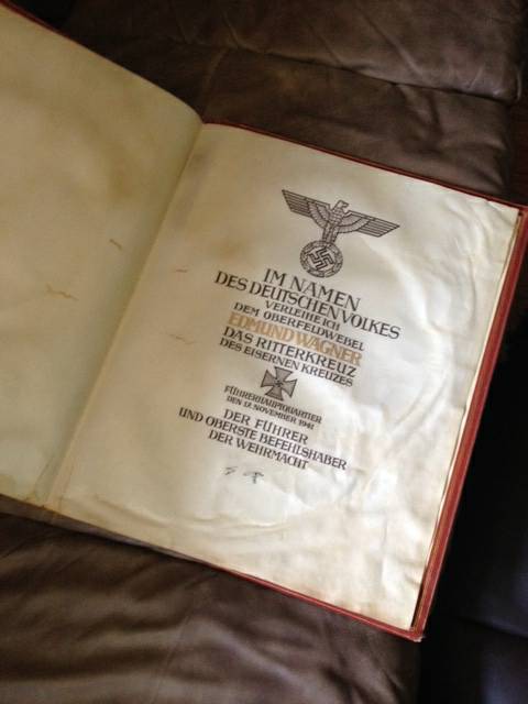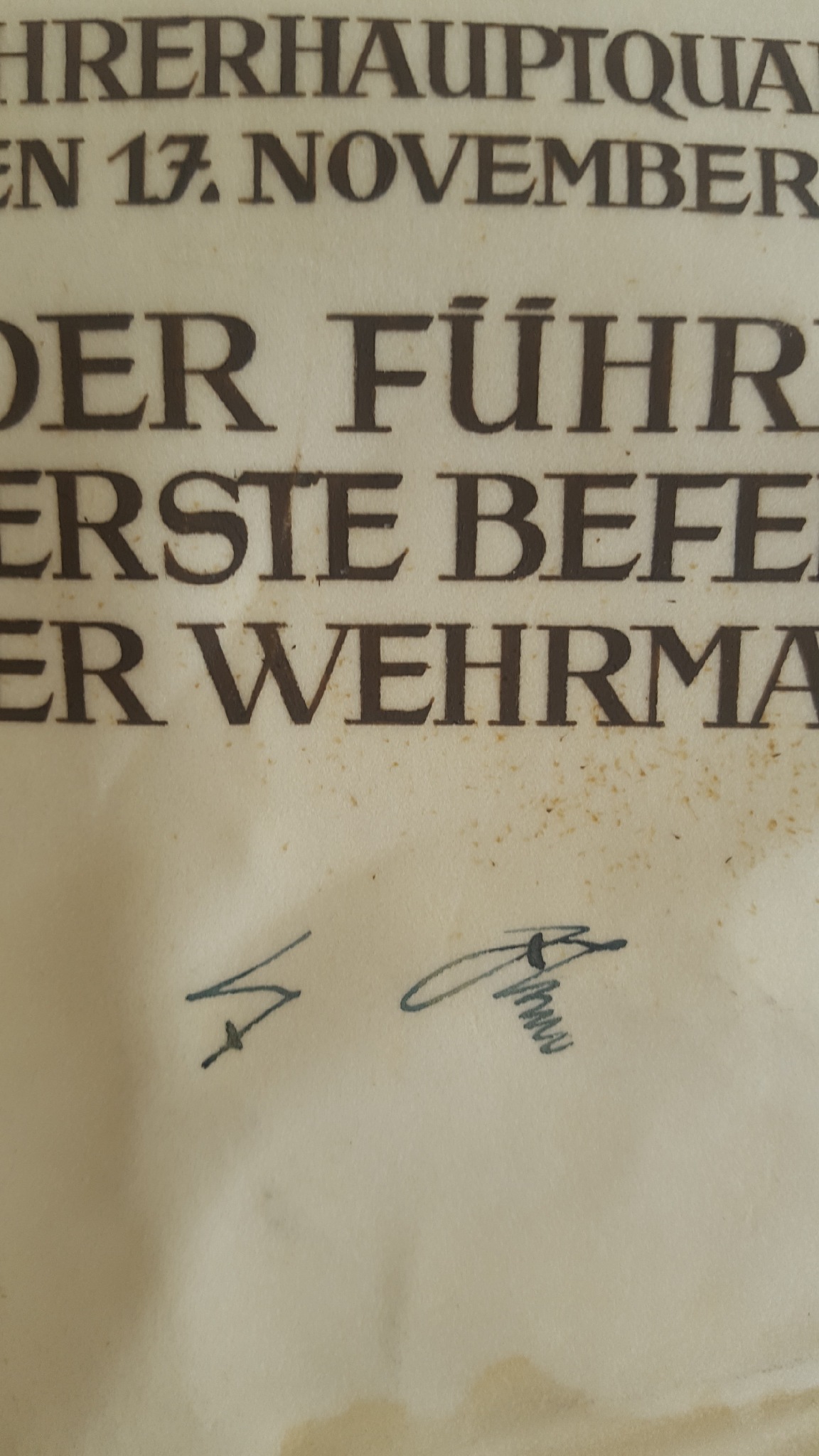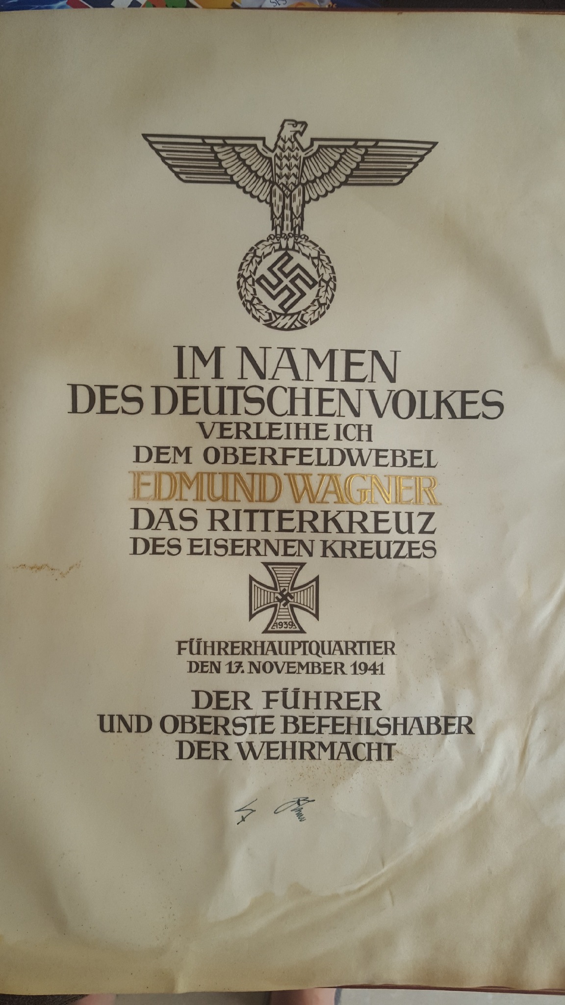 ahrtal Posted April 27, 2021 Posted April 27, 2021 Don't remember if I posted this before. Excuse me if I did. This is a formal award document awarded posthumously to a LW Oberfeldwebel Edmund Wagner. His first kill was over England in 1940. The remainder (55 kills) were on the Eastern Front. Edmund Wagner was killed on 13 November 1941 near Pawmutowka, Russia after being hit by Soviet flak. He was posthumously awarded the Knight's Cross on 17 November 1941. This bears an original AH signature. I actually got it from an online estate sale in Florida. My daughter lives there and picked it up for me. I had no idea that it was original at the time, nor that it was do massive. 1