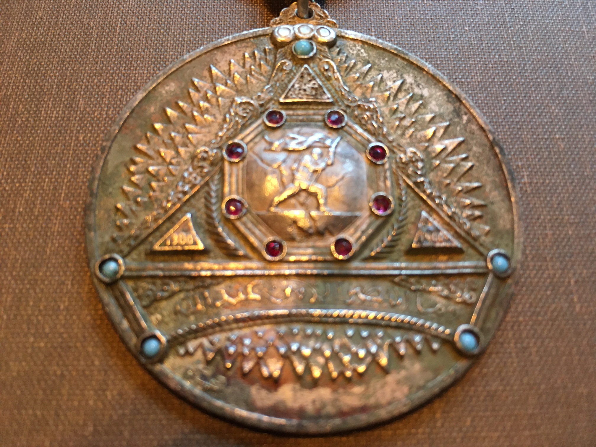 Aeronut Posted September 1, 2021 Posted September 1, 2021 I bought this medal in the Middle East a long time ago. This is the condition I purchased it in, but in spite of trying I have never been able to find another like it or information about what country it is from and what it was awarded for. I had forgotten about it until recently and am now working to figure this thing out. I believe the writing is either Arabic or Farsi. If anyone can translate that it would be helpful. A jeweller said that the ruby's are natural with the exception of one. We assume the tourqoise is Persian and could not identify the three white pieces at the top but are fairly certain they aren't diamonds. The jeweller did not have the chemicals to test the metal but I believe it's silver. Any information for figuring out this mystery would be great!