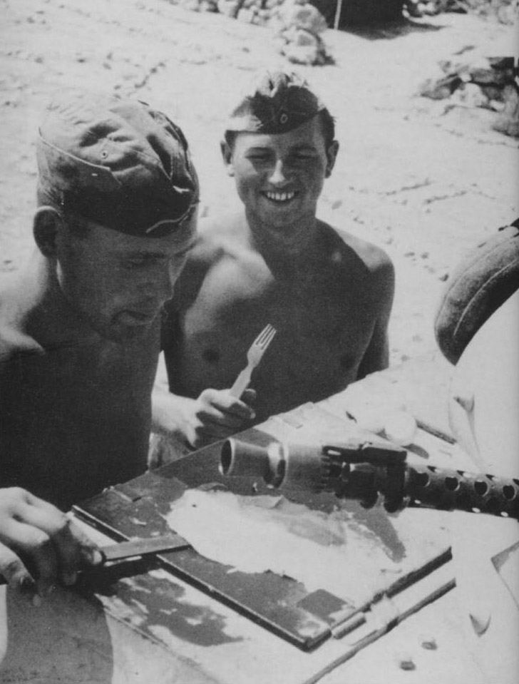 DAK D Posted April 16, 2016 Posted April 16, 2016 (edited) Hi All, Here are three super and really interesting photos from North Africa. German Soldier, two Italian allies and two British Paras with early helmets and Denison smocks. Tunisia GJR 756? This soldier must be from another unit in North Africa, as the paras were not at Longstop hill as far as I can ascertain. Members of 1. Zug/2. Kompanie/ Sonderverband 288 did attach the Edelweiss patch on their tropical field blouses and the german soldier could be from that unit. German helmets being given a coat of tan camo paint, some of these helmets look like Heer ones and that makes this photo a bit special. One from my own collection shows German MG34 crews getting some practice in and interestingly most of them are wearing the AfrikaKorps cuff title. D Edited April 17, 2016 by DAK D 2