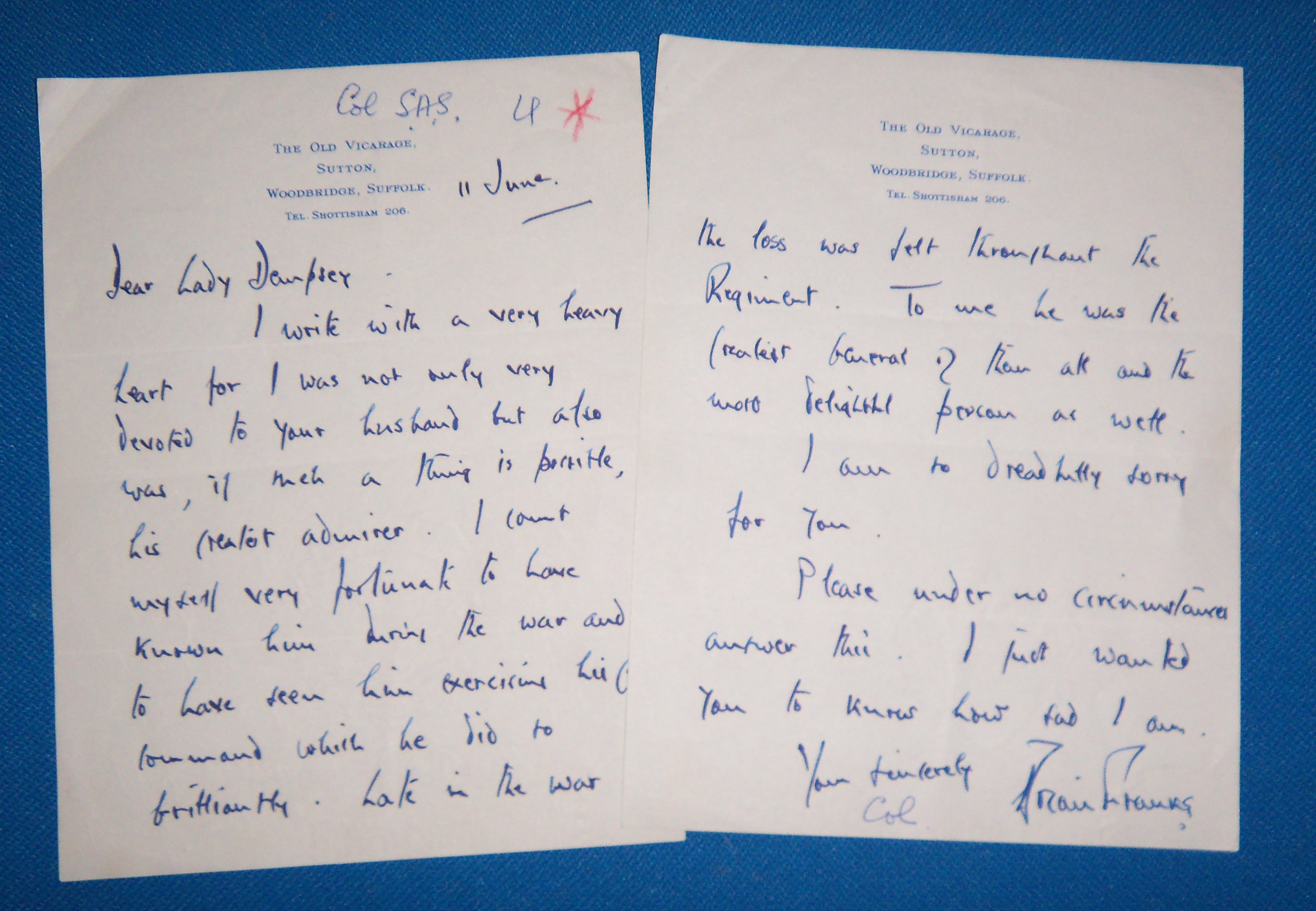 the colonel Posted March 9, 2016 Posted March 9, 2016 if you've seen my photo post ref Gen Dempsey, this is the 2 SAS lots I purchased with it, a hand written letter from Col Brian Franks to Lady Dempsey expressing the condolences of the regiment upon his death and an 8 page dossier typed by David Stirling outlying the history of the regiment, believed to be used as part of the push to keep the regiment post war, Dempsey was a big advocate of spec ops groups and as I'm sure your all aware was the first col commandant of the SAS 1