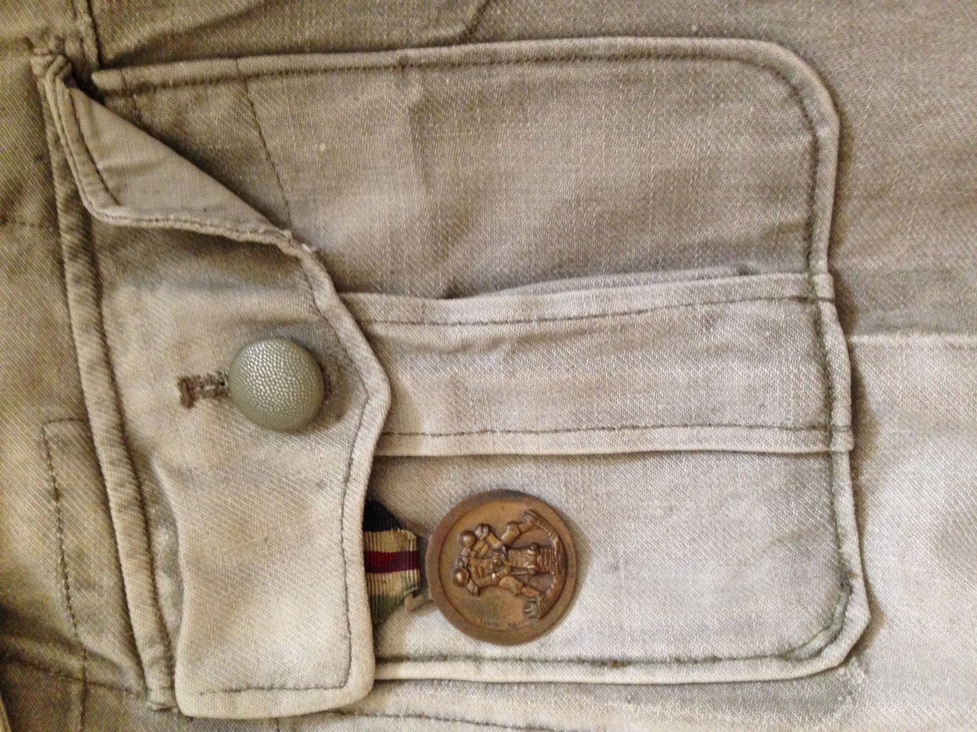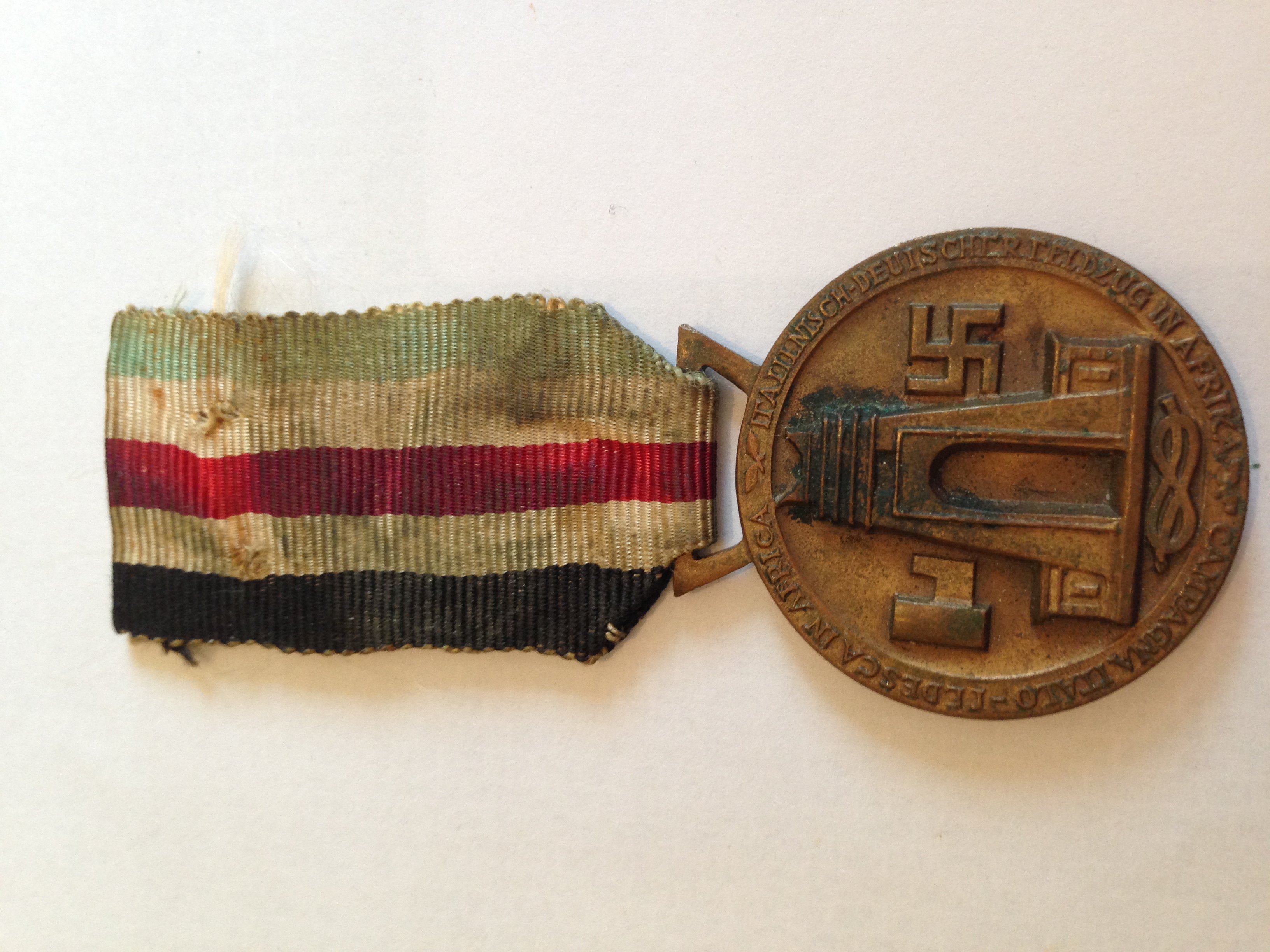 DAK D Posted March 28, 2016 Posted March 28, 2016 (edited) Here is an nice example of the Italian/German medal issued to German soldiers in North Africa. This medal was only issued to German forces that served or had seen service in North Africa. The medal obverse shows two gladiators that represent Germany and Italy fighting with a crocodile that represents England. The reverse shows the famous Arco De Feleni and both countries national emblems. The medal itself is a type two version. The photo of the Heer soldier in Africa is a very interesting one, as he is wearing a later 1st pattern tropical field blouse with larger breast pockets and his cap still has a waffenfarbe soutache attached. He is also wearing 3rd pattern tropical boots that show hard wear and fading and I would place this photo as early to mid 1942. Edited March 29, 2016 by DAK D 3